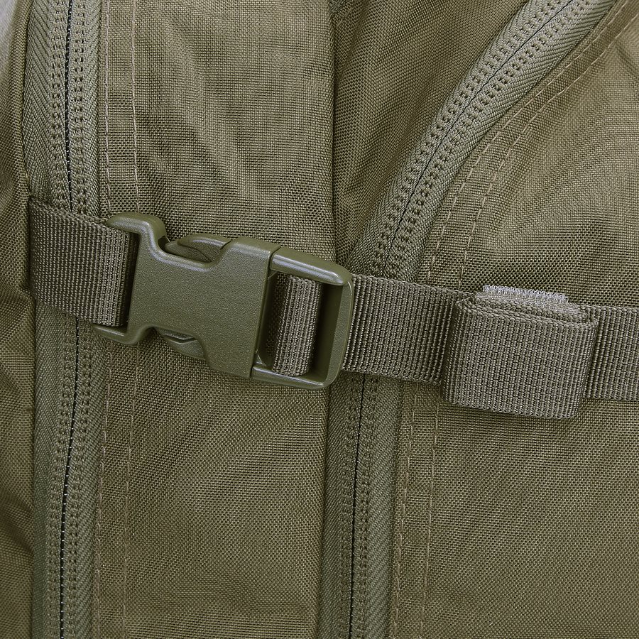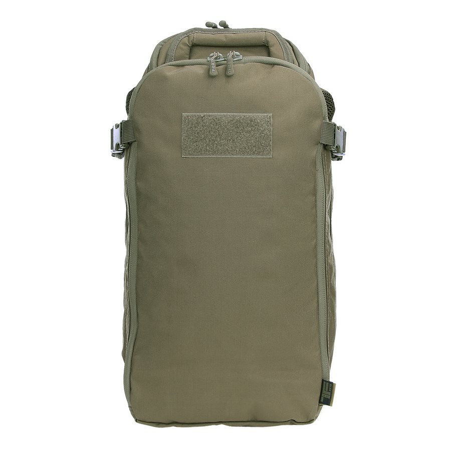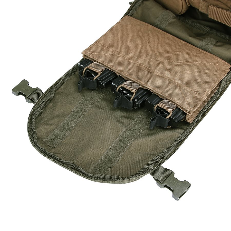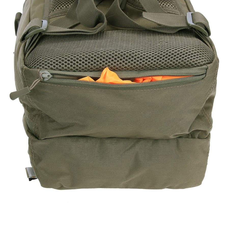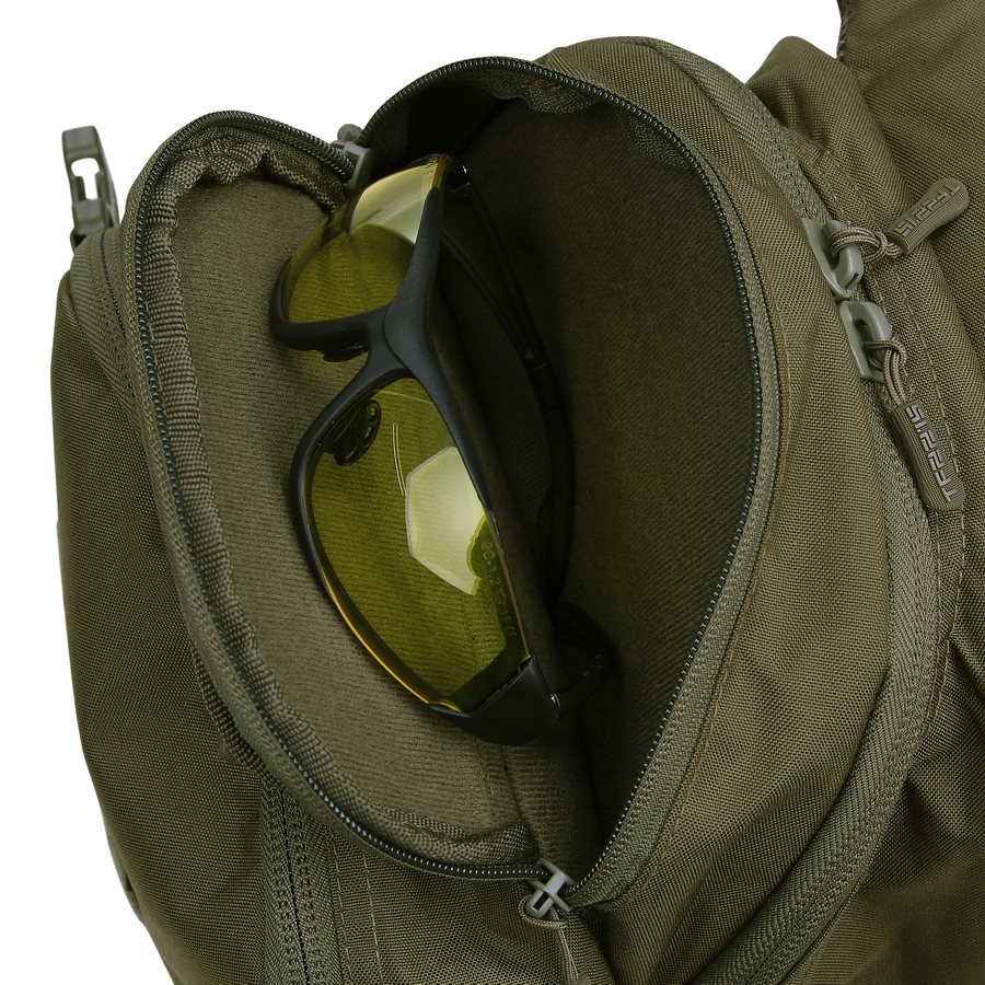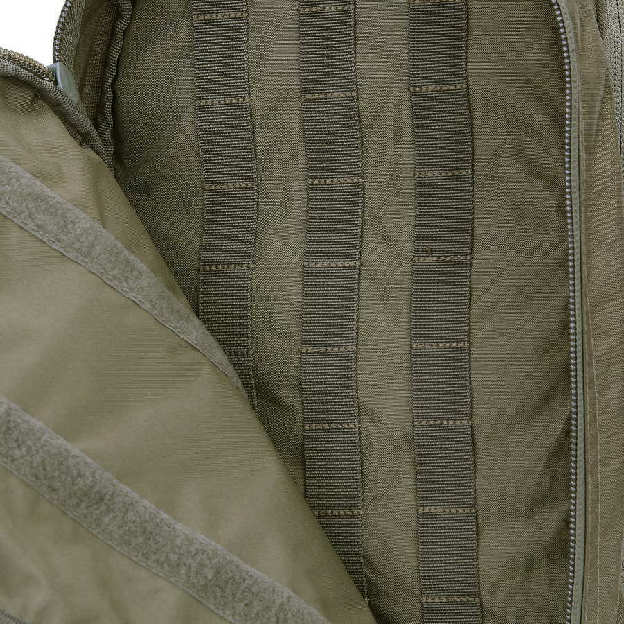 Le sac à dos est divisé en deux compartiments principaux accessibles par des fermetures éclair à double sens avec tirettes. Dans le compartiment avant, vous trouverez trois colonnes de sangles MOLLE/PALS, complétées par deux bandes VELCRA. Cette combinaison est idéale pour ranger divers étuis et inserts compatibles qui vous aideront à organiser parfaitement votre équipement pour toutes les occasions. Le compartiment arrière est légèrement plus spacieux que le compartiment avant. À l'intérieur, vous trouverez un compartiment pour les ordinateurs portables jusqu'à 15 pouces ou les poches à eau de trois litres, ainsi qu'un compartiment plat pour les documents. Un avantage appréciable est la possibilité de réduire les deux compartiments à l'aide de sangles de compression latérales fermées par des boucles en plastique. Au-dessus des compartiments principaux se trouve une petite poche doublée de molleton doux. Elle est idéale pour ranger des appareils électroniques ou des lunettes de tir.