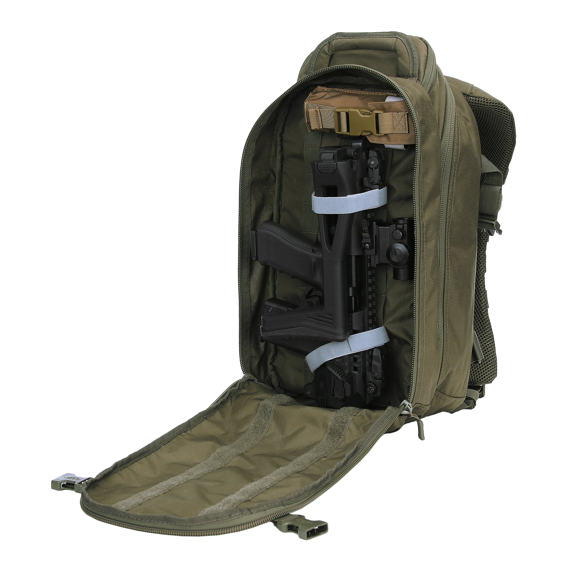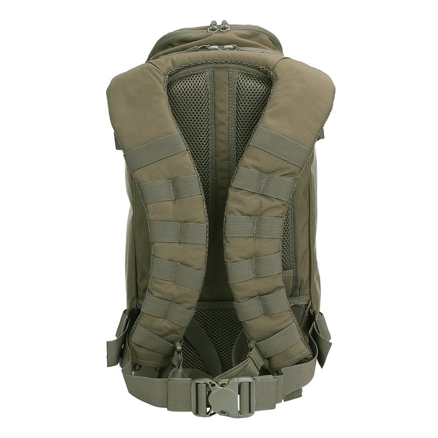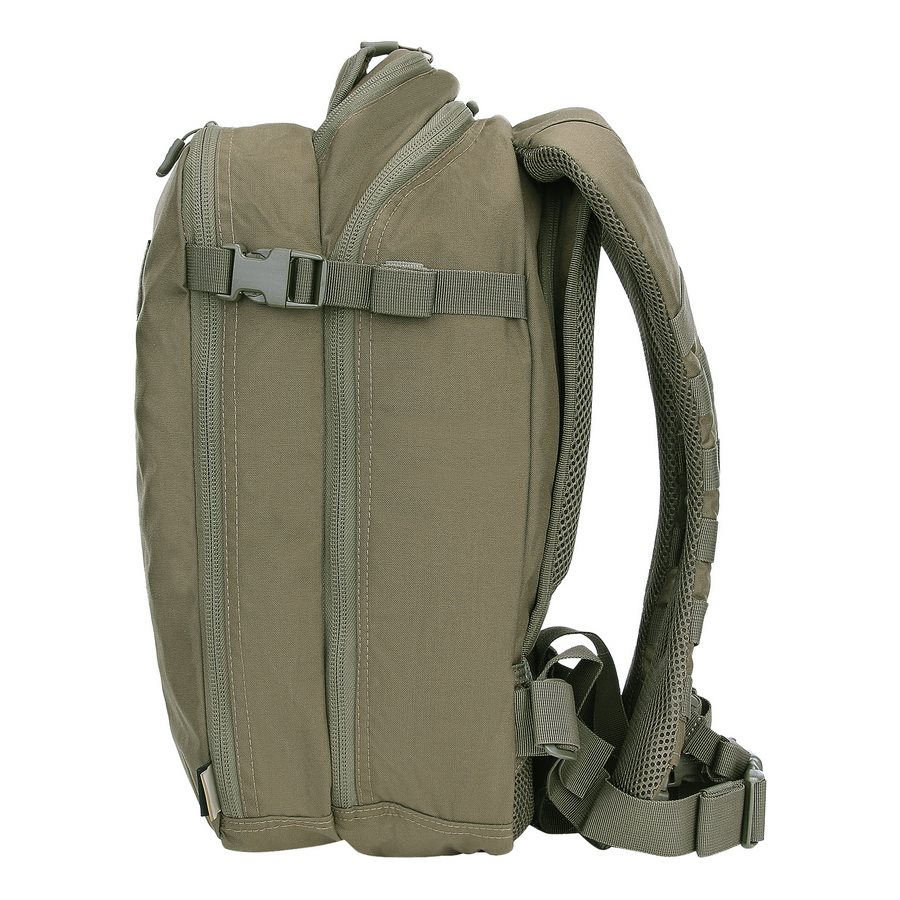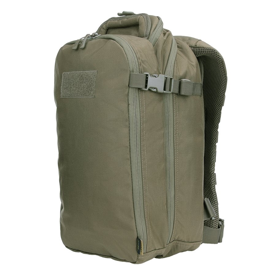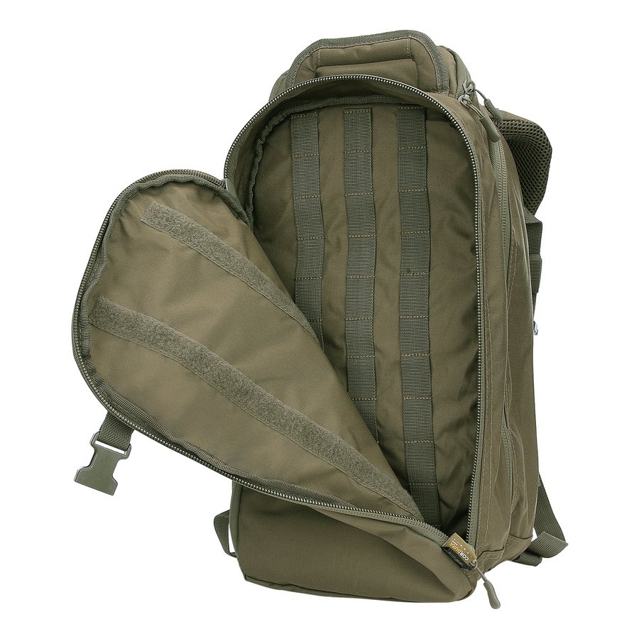 Le sac à dos est divisé en deux compartiments principaux accessibles par des fermetures éclair à double sens avec tirettes. Dans le compartiment avant, vous trouverez trois colonnes de sangles MOLLE/PALS, complétées par deux bandes VELCRA. Cette combinaison est idéale pour ranger divers étuis et inserts compatibles qui vous aideront à organiser parfaitement votre équipement pour toutes les occasions. Le compartiment arrière est légèrement plus spacieux que le compartiment avant. À l'intérieur, vous trouverez un compartiment pour les ordinateurs portables jusqu'à 15 pouces ou les poches à eau de trois litres, ainsi qu'un compartiment plat pour les documents. Un avantage appréciable est la possibilité de réduire les deux compartiments à l'aide de sangles de compression latérales fermées par des boucles en plastique. Au-dessus des compartiments principaux se trouve une petite poche doublée de molleton doux. Elle est idéale pour ranger des appareils électroniques ou des lunettes de tir.