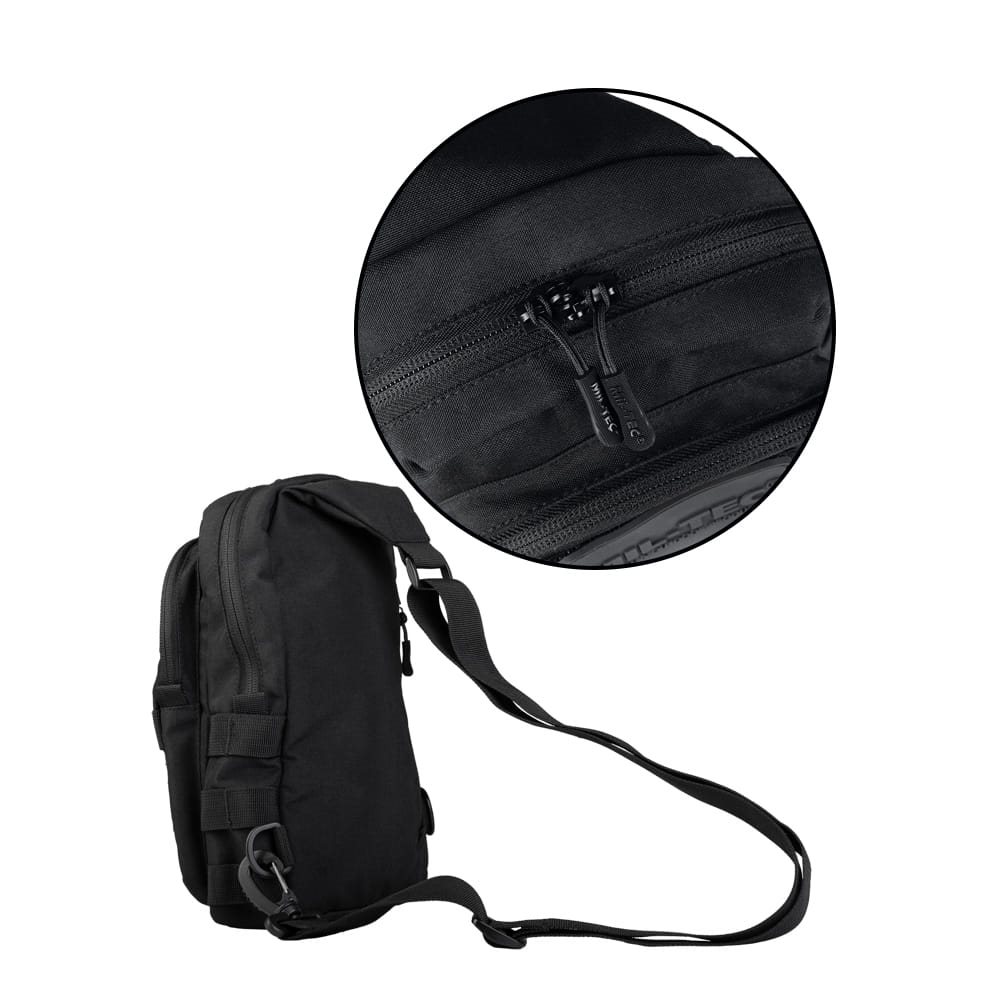 La bandoulière du sac est réglable en longueur et équipée d'un mousqueton en plastique. Le dos est agréablement rembourré et dispose d'une poche relativement spacieuse. À l'avant, vous trouverez un système de fixation modulaire MOLLE/PALS, un compartiment plat avec une poche intérieure accessible par fermeture éclair et un grand panneau velcro pour la personnalisation à l'aide d'écussons VELCRO. Le compartiment principal s'ouvre à l'aide d'une fermeture éclair à double sens et contient deux poches séparées.