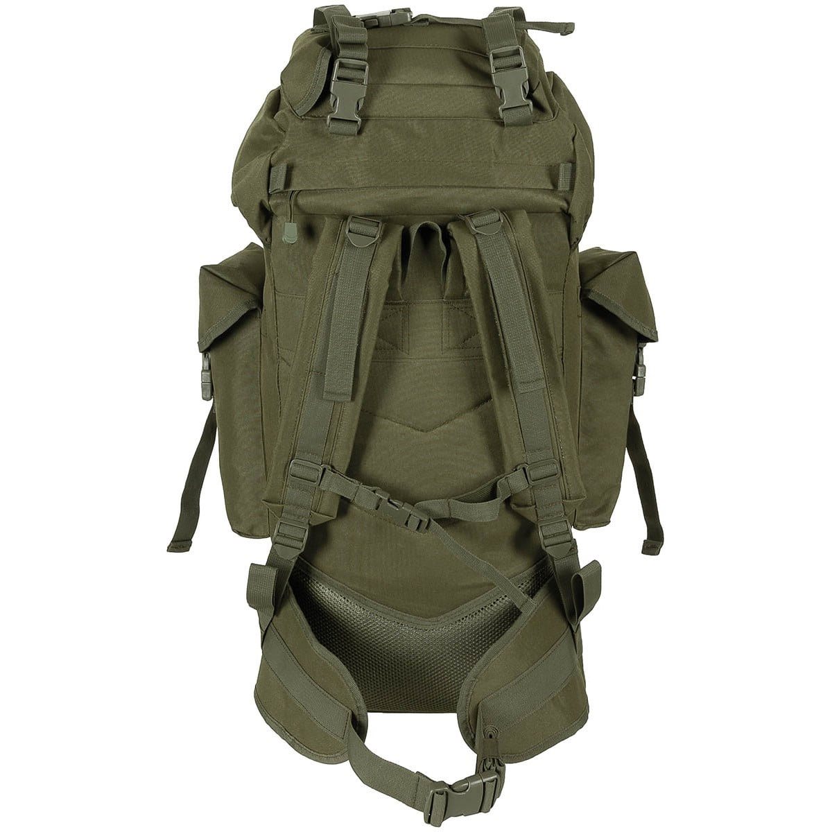 La face avant du sac à dos est équipée d'un grand nombre de sangles modulaires standard MOLLE/PALS, qui permettent d'ajouter des équipements compatibles tels que des pochettes, des étuis, etc. Au centre du sac à dos se trouve une grande poche fermée par une fermeture éclair à sens unique avec tirette. À l'extérieur, vous trouverez une longue bande de velcro pour vos étiquettes nominatives ou vos écussons velcro. La partie inférieure donne accès à la partie inférieure de l'intérieur du sac à dos. Le rabat se fixe à l'aide de deux sangles avec des boucles en plastique et dispose d'une bande Velcro, d'une poche extérieure supérieure avec rabat et d'une poche inférieure plate. Les sangles avant peuvent être utilisées comme sangles de compression et, si nécessaire, pour fixer de petits équipements au fond du sac à dos.