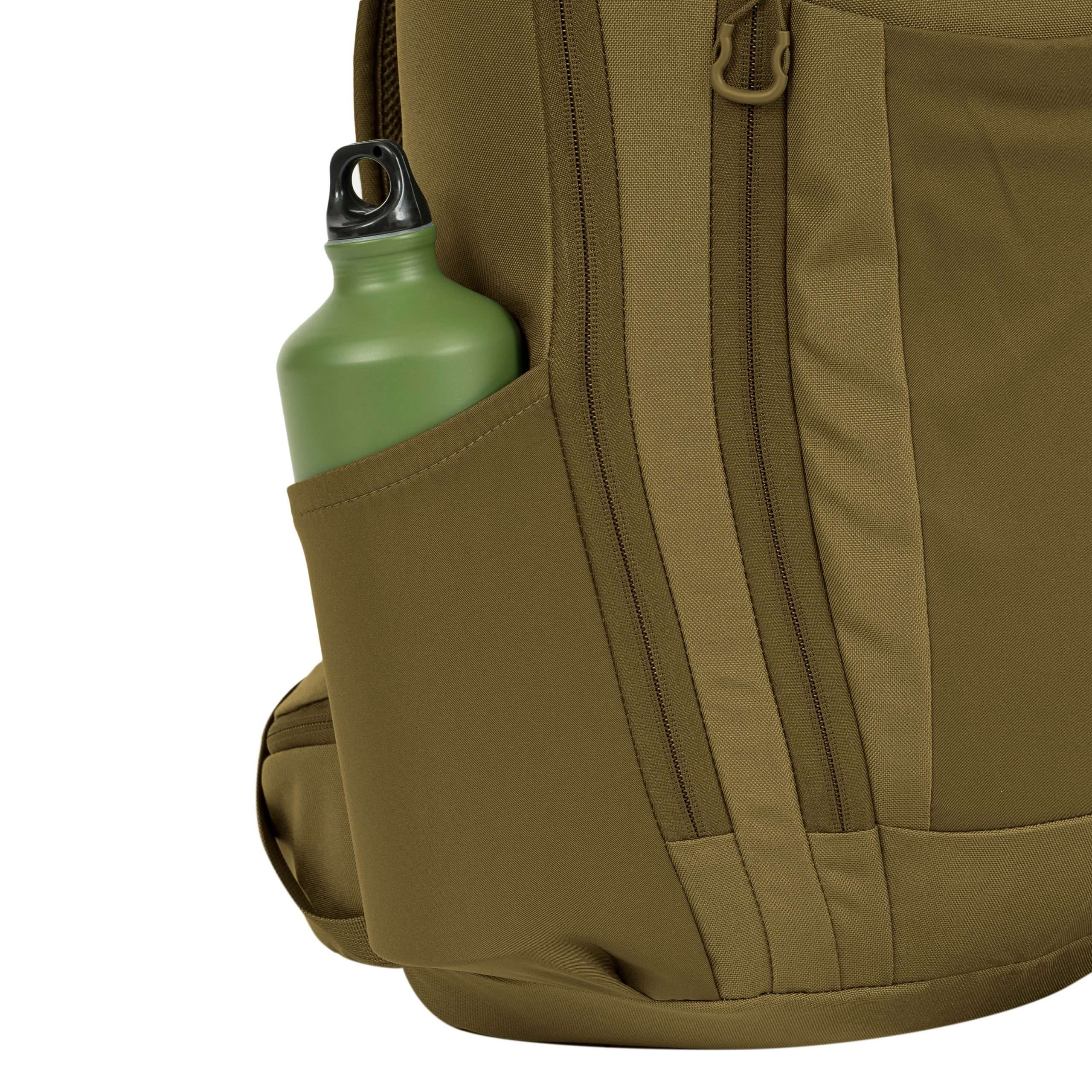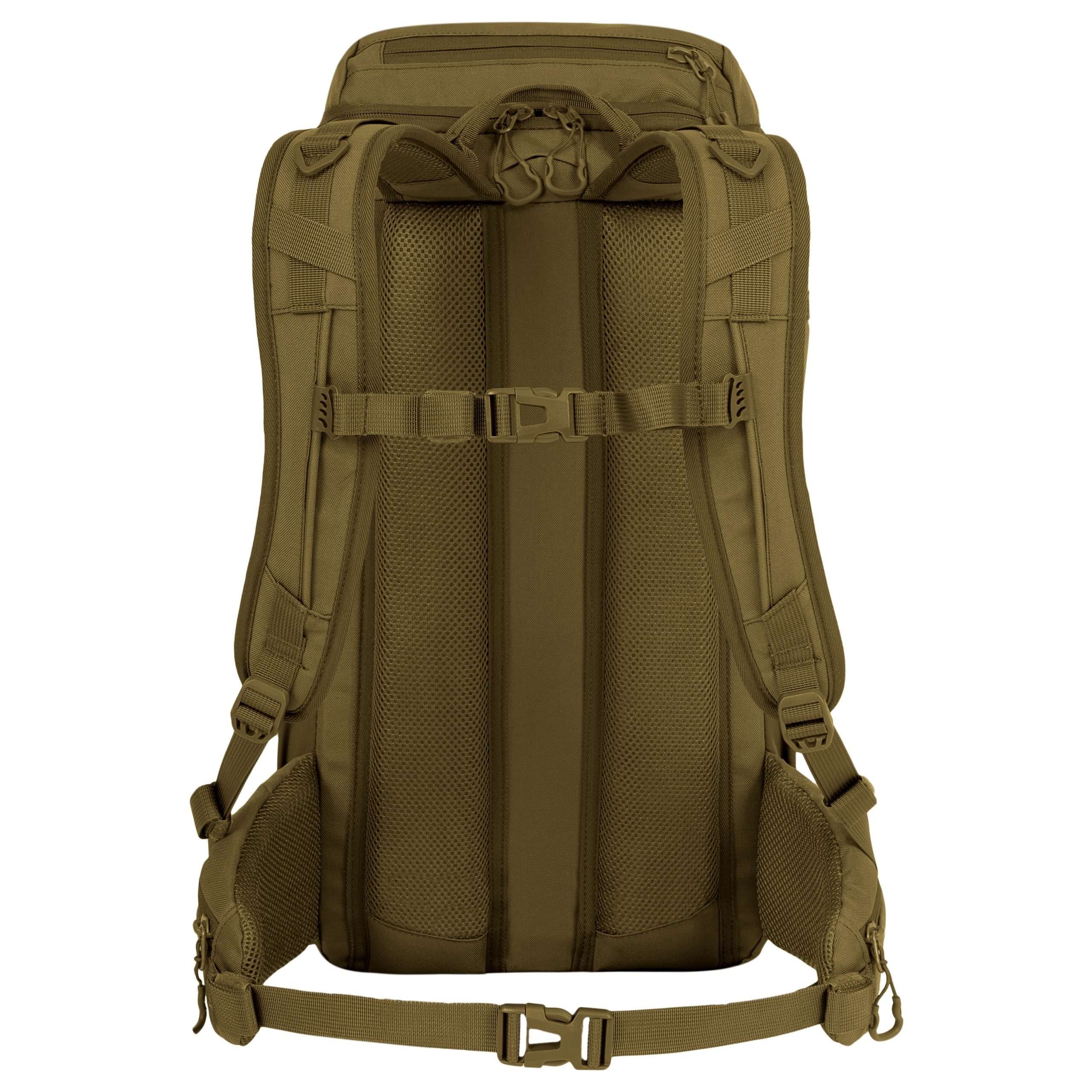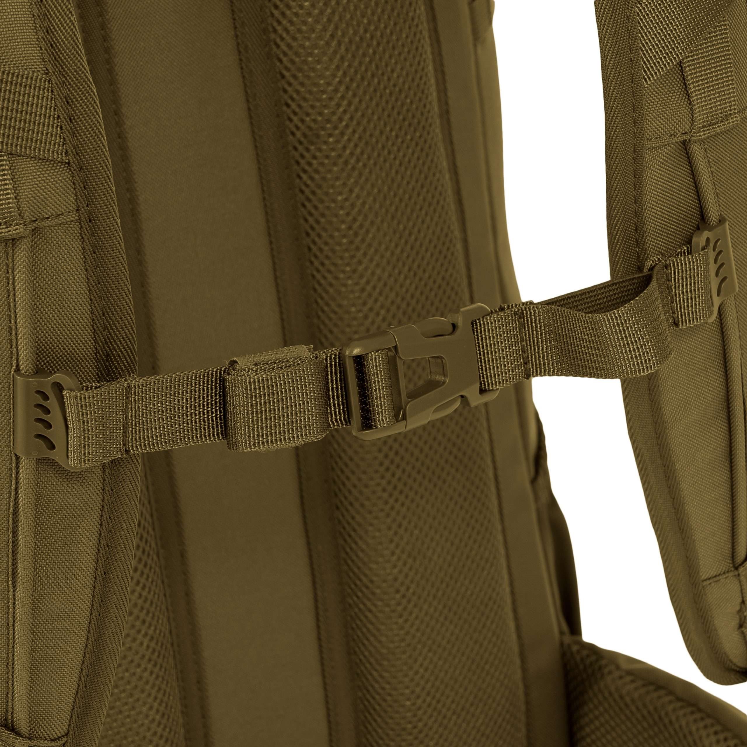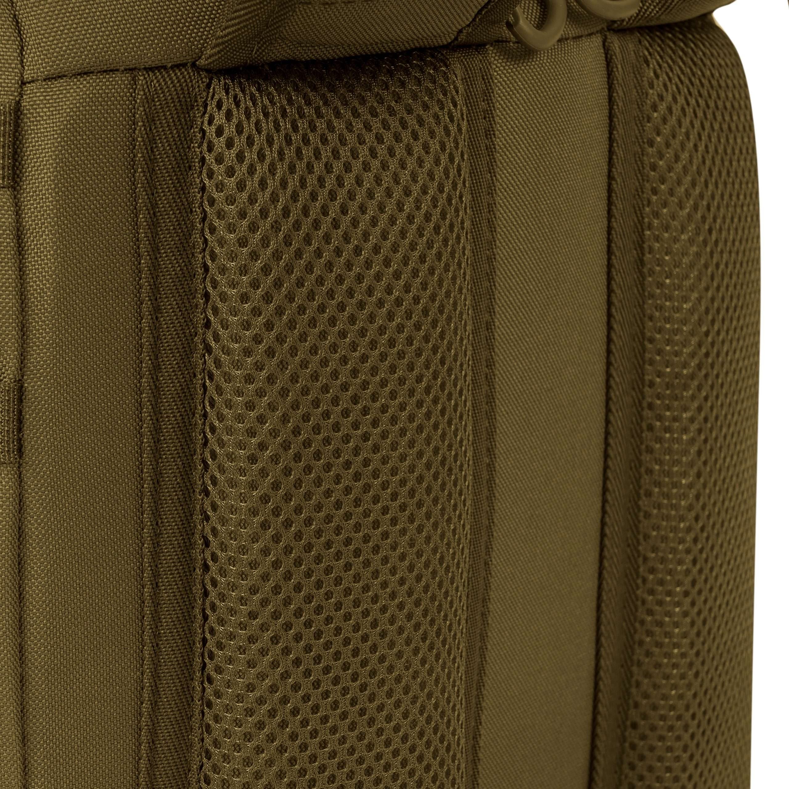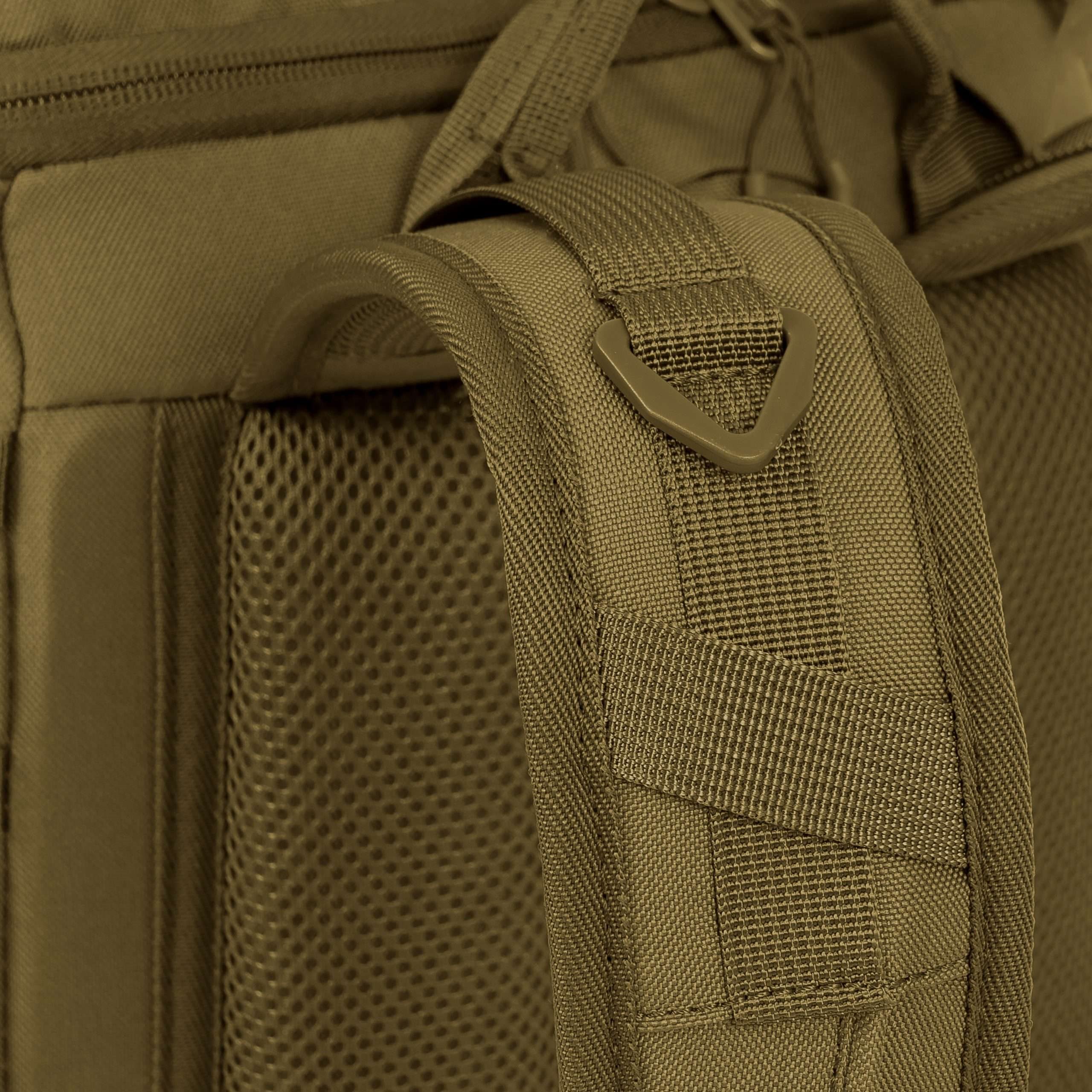 Le dos du sac à dos est généreusement rembourré à l'aide d'une maille 3D dont la forme conserve un canal central améliorant la ventilation. Dans la partie supérieure du dos, vous trouverez une poignée de transport classique en tissu. Les bretelles sont entièrement réglables, rembourrées, équipées de sangles de stabilisation, de triangles en plastique, de passages pour faire passer le tuyau de la poche à eau et d'une sangle thoracique élastique réglable en hauteur, qui se ferme à l'aide d'une boucle en plastique. La ceinture du sac à dos est partiellement rembourrée, fermée par une boucle en plastique et dispose de petites poches zippées des deux côtés. Sur les côtés du sac à dos, vous trouverez trois rangées de sangles MOLLE/PALS réduites et des poches élastiques. Le rabat principal du sac à dos est équipé d'une bande de sangles MOLLE/PALS, d'un compartiment central spacieux, d'une poche supérieure et d'un petit panneau VELCRO.