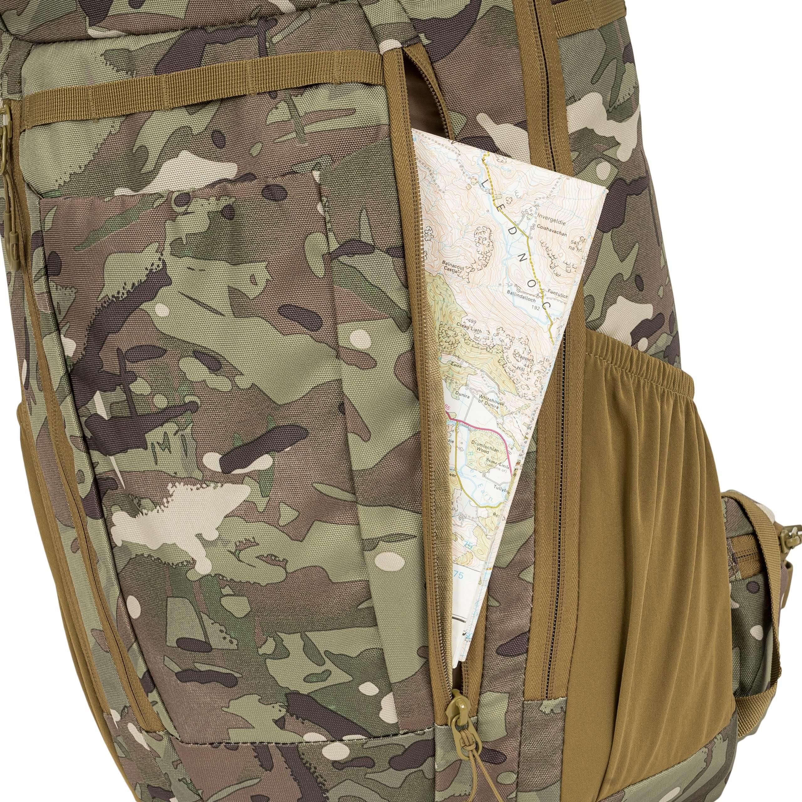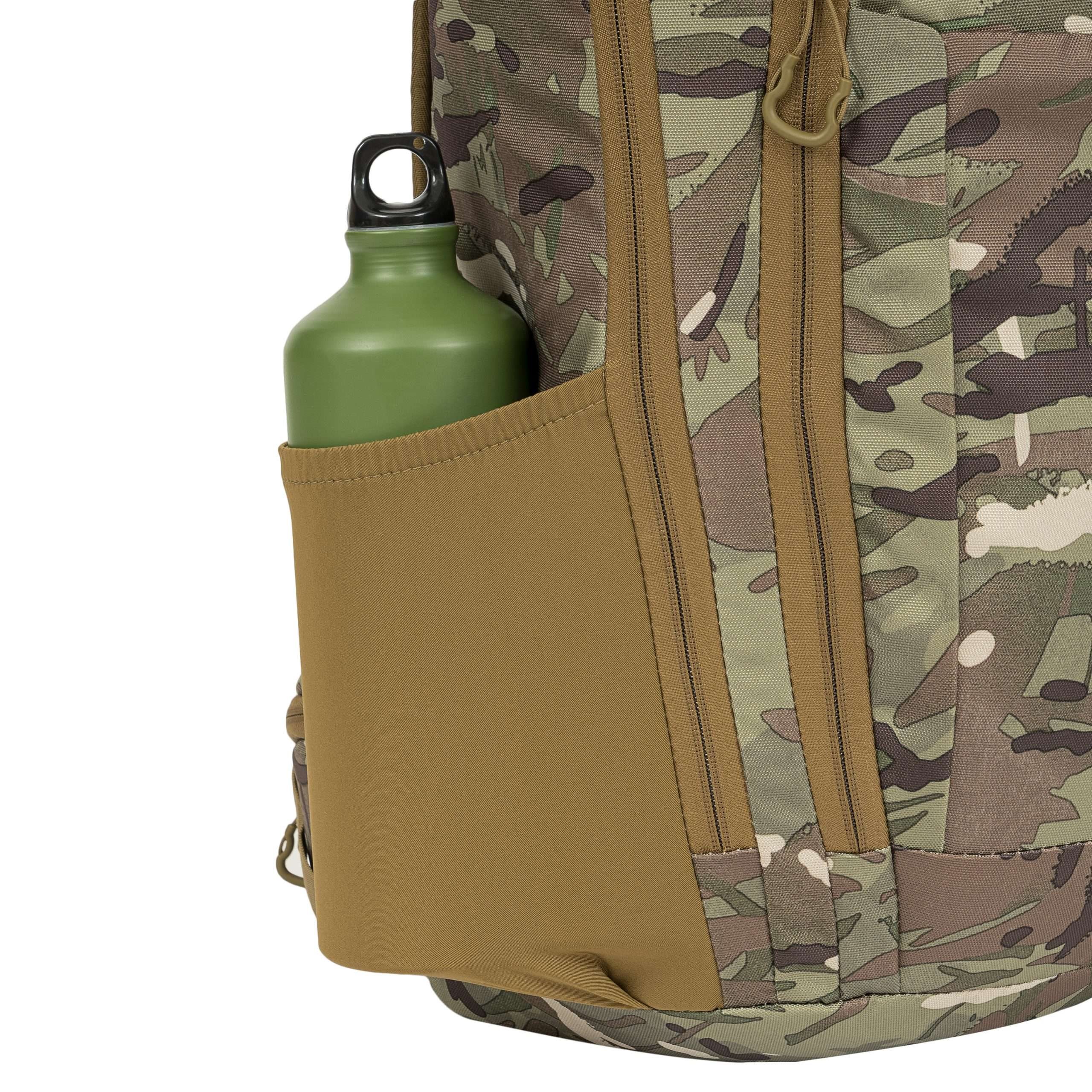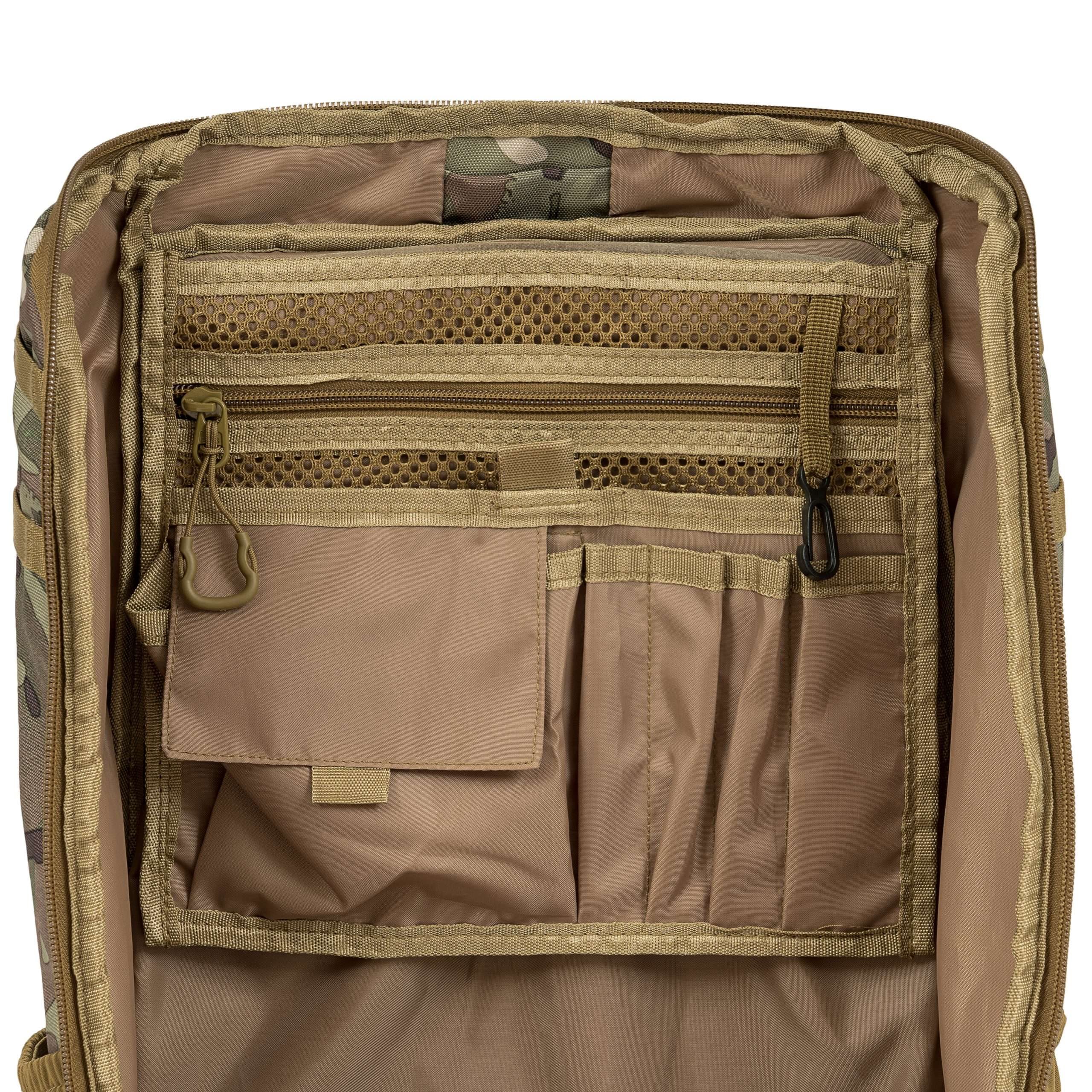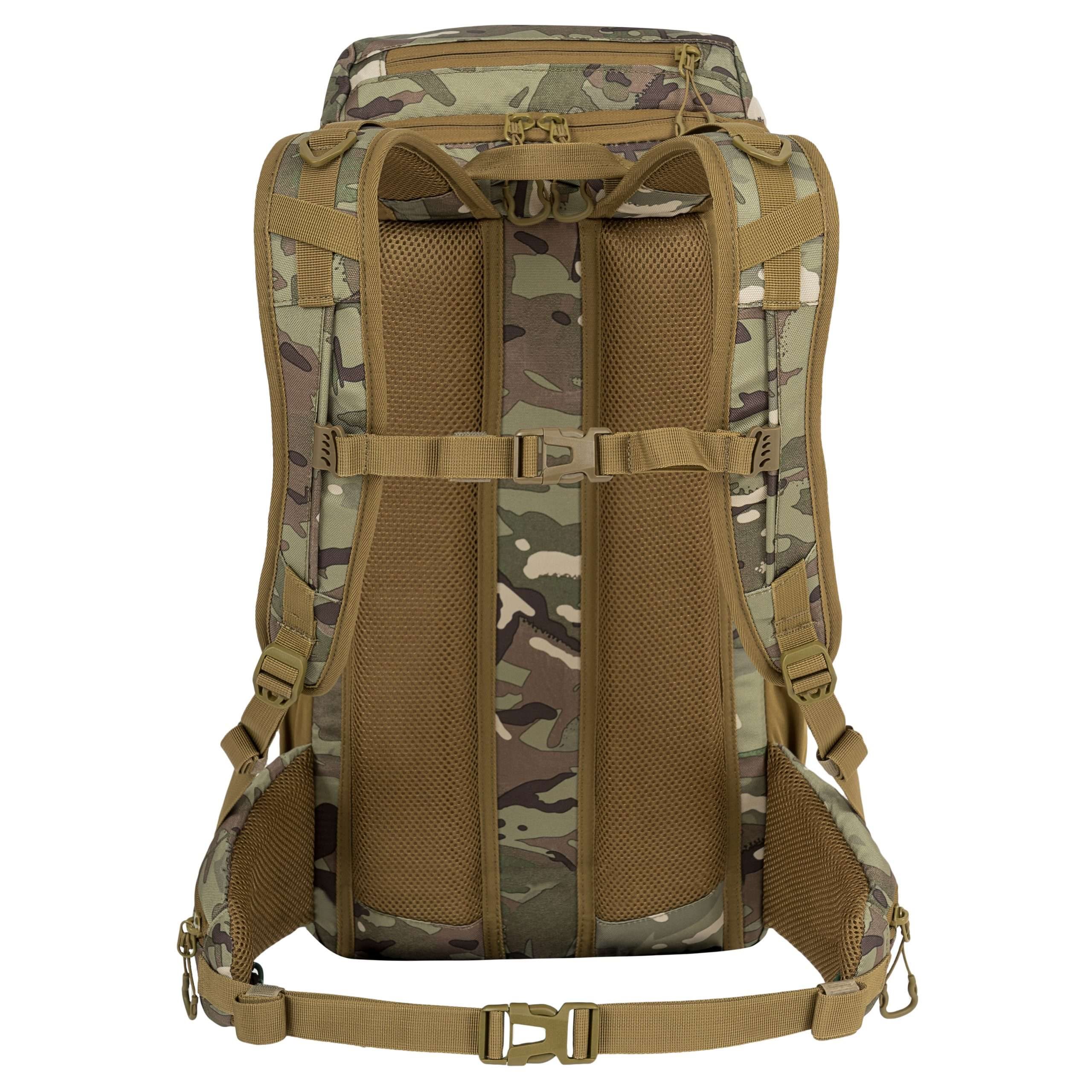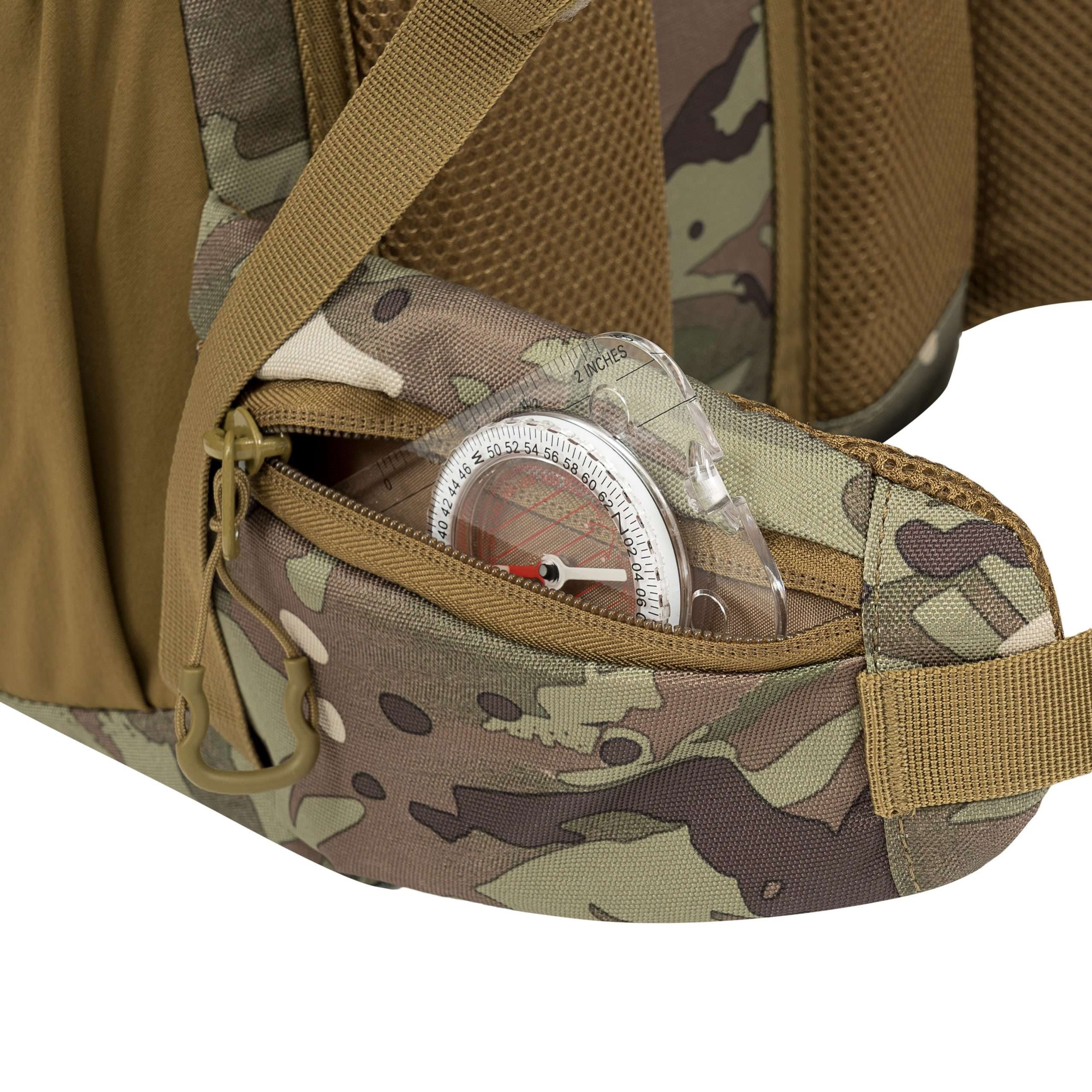 Le dos du sac à dos est généreusement rembourré à l'aide d'une maille 3D dont la forme conserve un canal central améliorant la ventilation. Dans la partie supérieure du dos, vous trouverez une poignée de transport classique en tissu. Les bretelles sont entièrement réglables, rembourrées, équipées de sangles de stabilisation, de triangles en plastique, de passages pour faire passer le tuyau de la poche à eau et d'une sangle thoracique élastique réglable en hauteur, qui se ferme à l'aide d'une boucle en plastique. La ceinture du sac à dos est partiellement rembourrée, fermée par une boucle en plastique et dispose de petites poches zippées des deux côtés. Sur les côtés du sac à dos, vous trouverez trois rangées de sangles MOLLE/PALS réduites et des poches élastiques. Le rabat principal du sac à dos est équipé d'une bande de sangles MOLLE/PALS, d'un compartiment central spacieux, d'une poche supérieure et d'un petit panneau VELCRO.