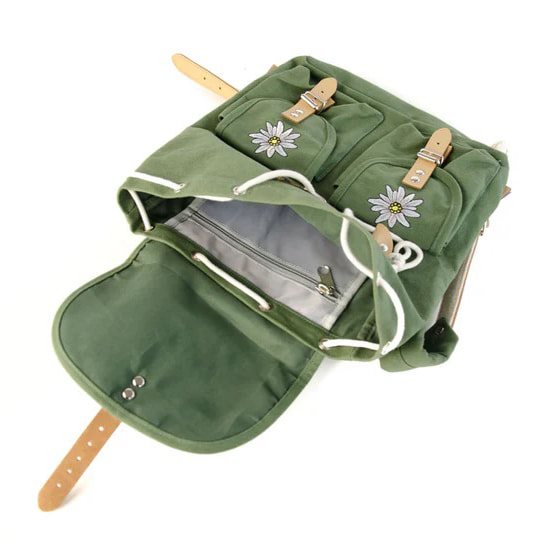 Sac à dos pour enfants/femmes fabriqué en toile de coton résistante et orné d'une broderie représentant l'edelweiss. L'ensemble de l'espace de rangement du sac à dos se ferme à l'aide de sangles en cuir dotées de boucles métalliques. Plus d'informations