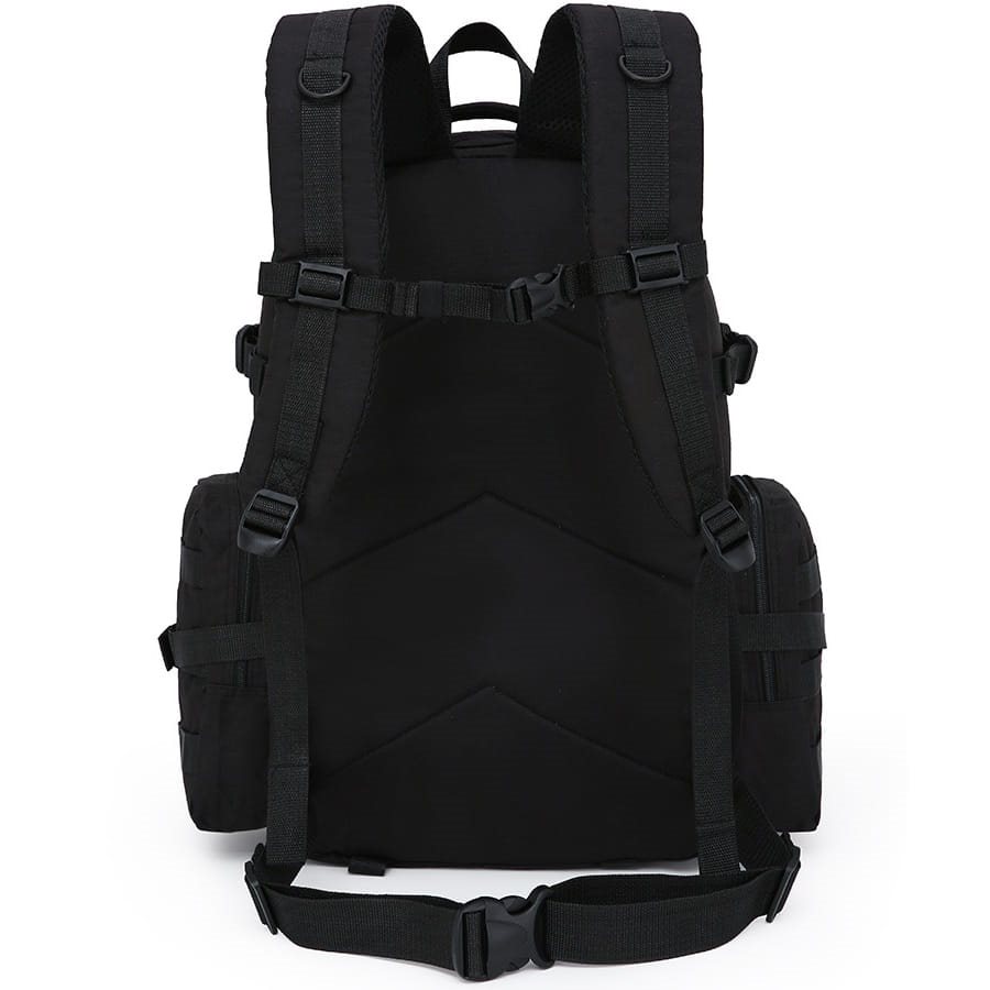 Les bretelles réglables sont légèrement incurvées, généreusement rembourrées, équipées d'anneaux en D en plastique et d'une sangle pectorale réglable en hauteur avec une boucle en plastique. Le dos est rembourré de mousse souple et comporte une poignée de transport confortable dans sa partie supérieure. La ceinture abdominale est réglable en largeur, composée d'une simple sangle et d'une boucle en plastique. Les côtés sont équipés de deux sangles de compression et de poches à fermeture éclair pouvant contenir une gourde américaine d'un litre. Ces poches sont également recouvertes d'une fixation modulaire de type MOLLE/PALS, qui vous permet d'attacher des équipements supplémentaires compatibles tels que des pochettes, des étuis, etc. L'avant du sac à dos est divisé en trois poches séparées accessibles par des fermetures éclair à double sens. Vous y trouverez également un système de fixation modulaire, complété dans la partie supérieure par une bande Velcro destinée à vos étiquettes VELCRO et vos écussons d'identification. Le compartiment principal s'ouvre à l'aide d'une fermeture éclair à double sens et comprend plusieurs poches pour faciliter l'organisation de votre équipement, ainsi qu'un compartiment élastique pour une tablette ou un petit ordinateur portable.