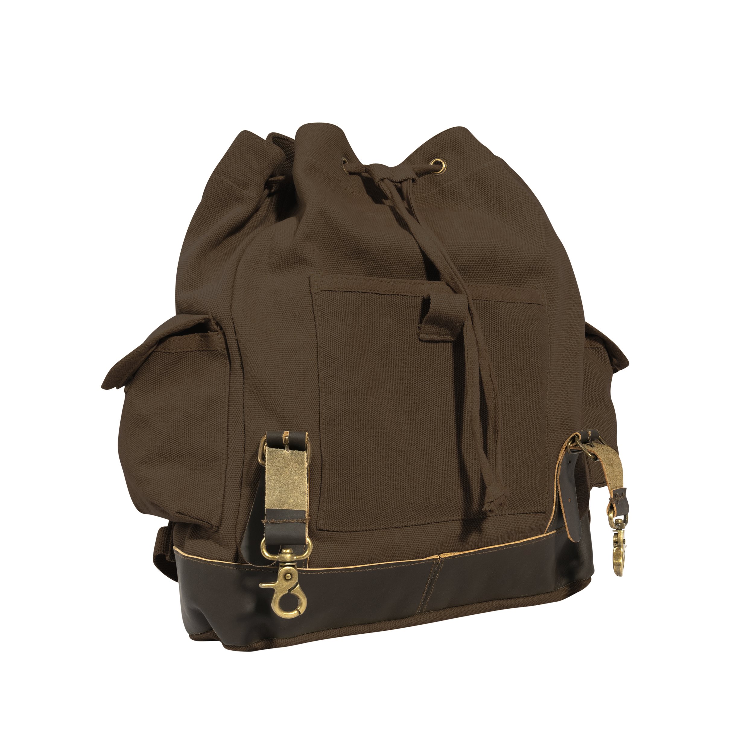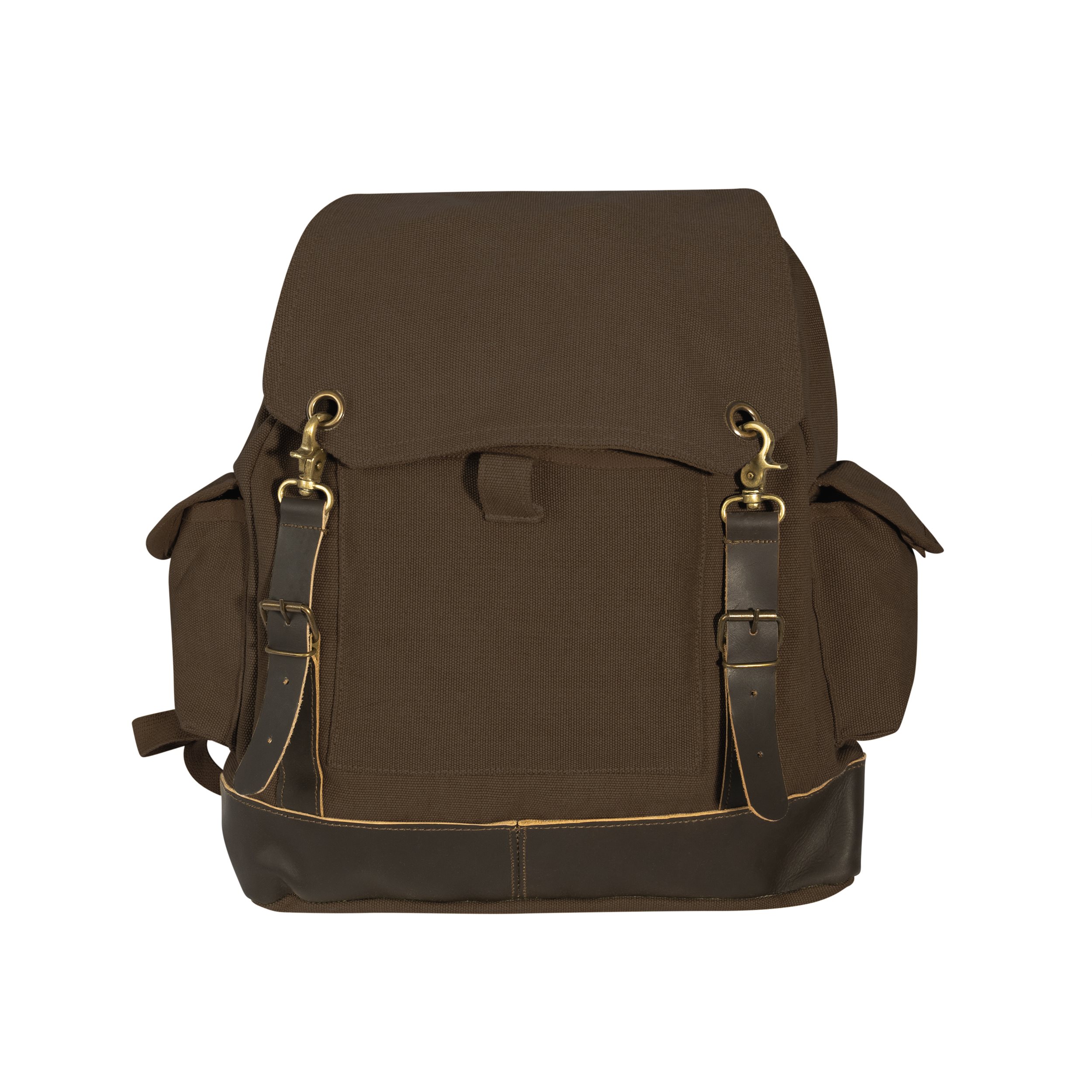 Sac à dos classique de petite taille en toile de coton épaisse au design vintage, agrémenté de détails en cuir et en laiton. Accessoire élégant et pratique pour tout randonneur qui se respecte.
