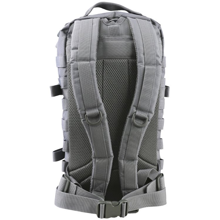 Les bretelles du sac à dos sont anatomiquement incurvées, réglables en hauteur, généreusement rembourrées avec une maille 3D et équipées d'anneaux en plastique en D. La ceinture du sac à dos est constituée d'une simple sangle qui se ferme à l'aide d'une boucle en plastique FASTEX et est réglable en longueur. Elles sont également rembourrées et comportent un compartiment pour une poche à eau. Sur les côtés du sac à dos, vous trouverez un système d'attache MOLLE/PALS, idéal pour fixer des équipements supplémentaires compatibles. En plus du système d'attache sur les côtés, vous trouverez également une paire de sangles de compression fermées par une boucle en plastique.