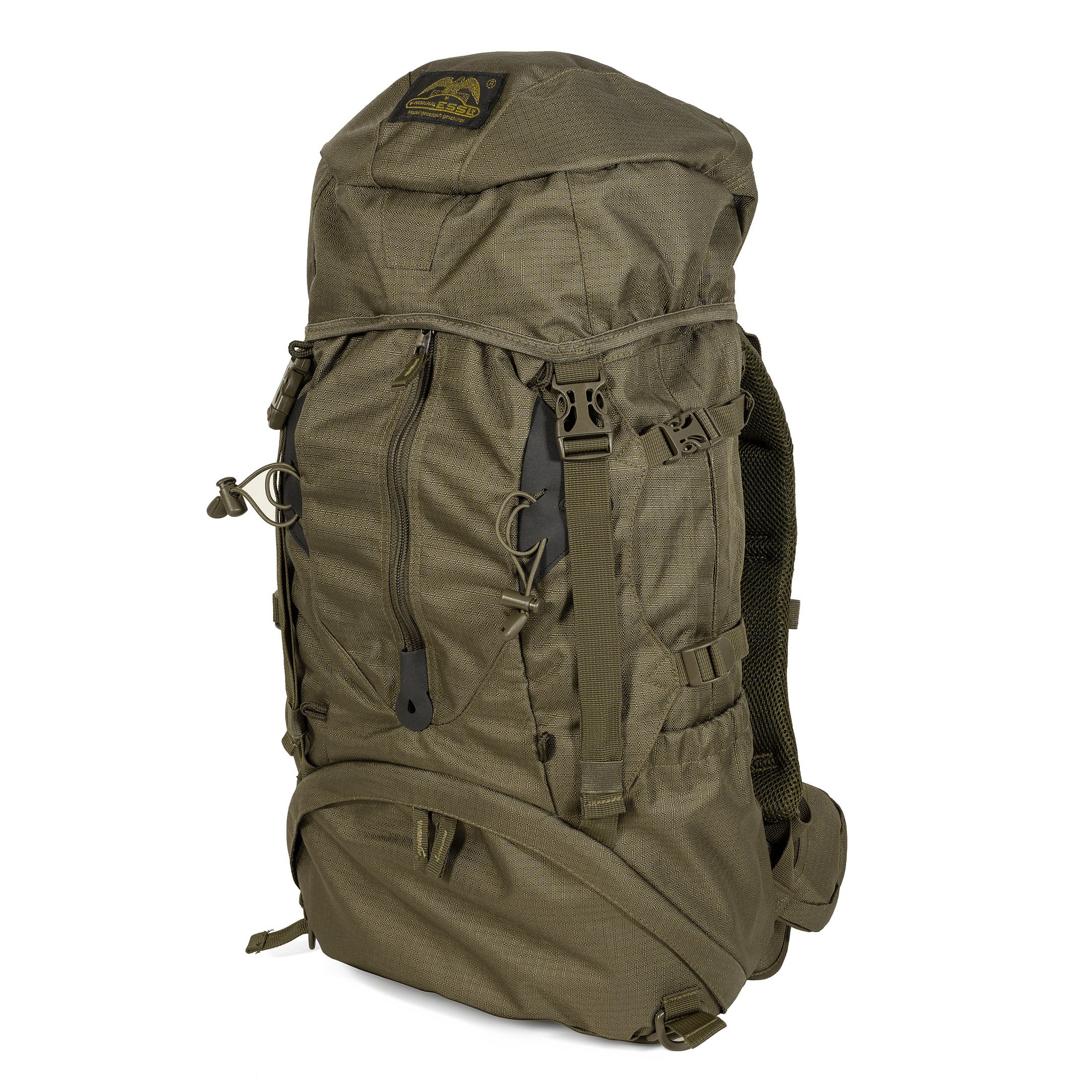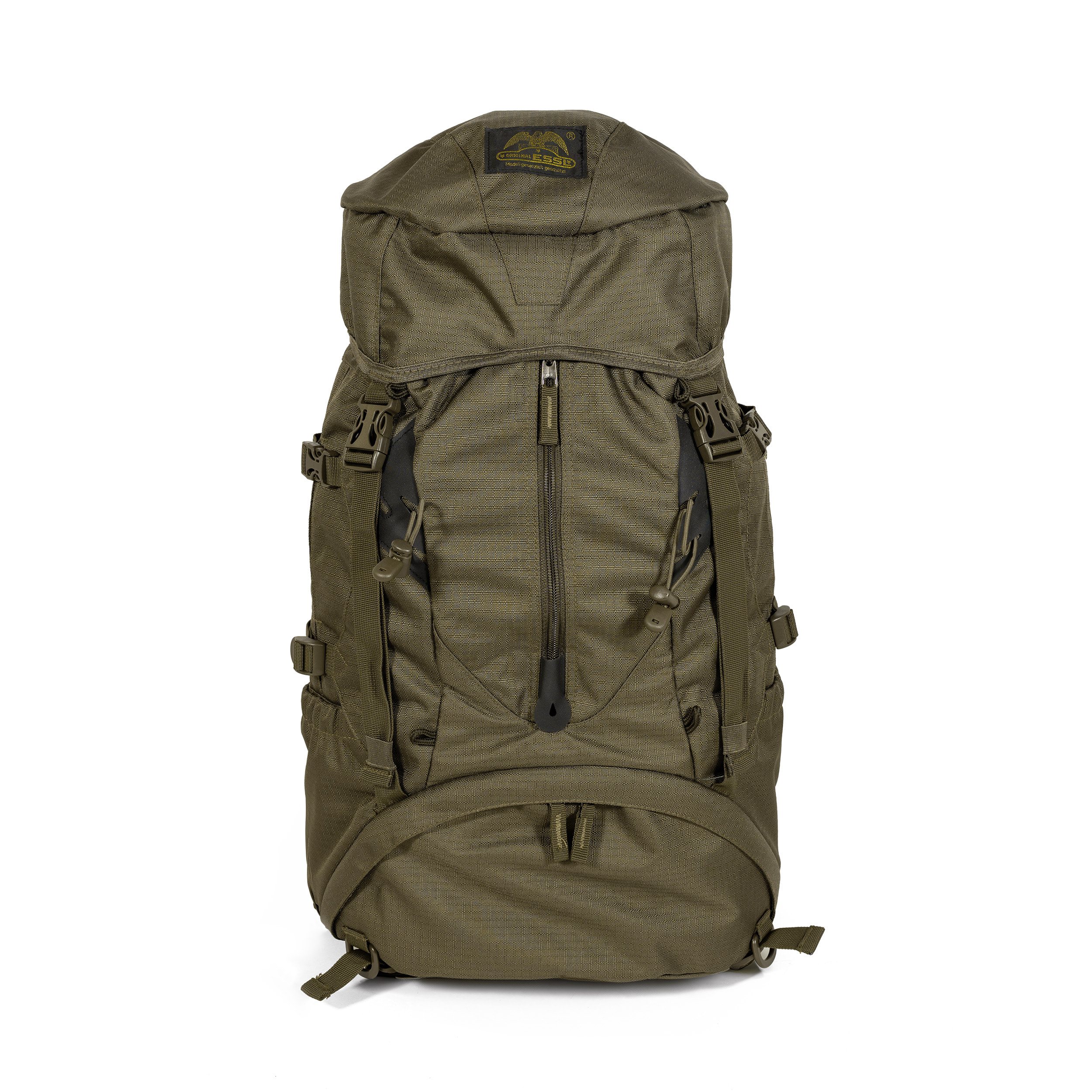 Sac à dos de taille moyenne pour la randonnée, la chasse ou les applications tactiques, avec chargement par le haut et par le bas. L'entrée supérieure est équipée d'un rabat avec une poche extérieure et une poche intérieure à fermeture éclair. L'entrée inférieure est sécurisée par une fermeture éclair à double sens recouverte d'un rabat. À l'intérieur du sac à dos, on trouve un compartiment pour une poche à eau et une ouverture centrale pour faire passer le tuyau. L'espace intérieur du sac à dos peut être divisé en deux compartiments, supérieur et inférieur, à l'aide d'un collier de serrage. Le sac à dos dispose d'une poche frontale pour carte et de quatre poches latérales. Les plus grandes sont fermées par des fermetures éclair verticales et peuvent contenir, par exemple, une gourde de 1 litre. Les poches inférieures ouvertes sont adaptées aux petites bouteilles ou au rangement des bâtons de randonnée. Sur les côtés, on trouve également des sangles de compression et, à l'avant, des boucles pour fixer des piolets. Une housse de pluie intégrée se trouve dans la petite poche au fond du sac à dos. Le sac à dos est également livré avec un support en matière élastique qui se fixe à l'avant du sac à dos. Il sert à fixer un casque, une veste enroulée, etc.