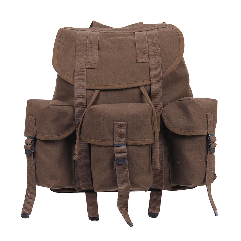 Version réduite du sac à dos militaire populaire ALICE. Le sac à dos est fabriqué en toile de coton épaisse. Le compartiment principal se ferme à l'aide d'un cordon et est recouvert d'un rabat avec des sangles. Trois poches extérieures avec fermeture à sangles et boucles. Les sangles sont réglables et suffisamment larges pour un transport confortable.