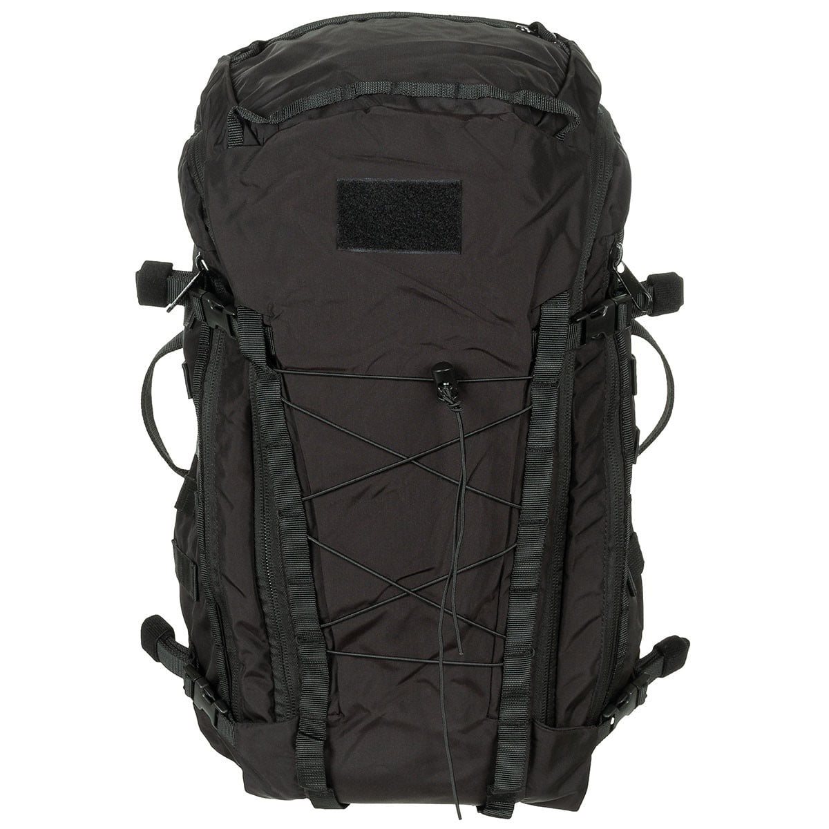 Les bretelles sont réglables en longueur, légèrement incurvées, équipées de deux passants pour le tuyau d'une poche à eau et d'une sangle pectorale avec boucle en plastique. La ceinture est composée d'une sangle et d'une boucle en plastique. Sur les côtés et sur le dessus, vous trouverez des poignées pour faciliter le transport du sac à dos. Sur les côtés, vous trouverez des sangles de compression et des poches accessibles par des fermetures éclair. La face avant est équipée d'une bande Velcro et d'un cordon élastique permettant de fixer, par exemple, une veste coupe-vent. Dans la partie supérieure du rabat, vous trouverez une poche adaptée au rangement de petits équipements. Le compartiment principal est accessible par une fermeture éclair à double sens. À l'intérieur, vous trouverez plusieurs boucles en sangle, un petit mousqueton en plastique pour accrocher une poche à eau et plusieurs bandes de molleton doux. Celui-ci sert principalement à fixer les étuis MISSION vendus séparément, mais peut également être utilisé pour d'autres équipements fixés à l'aide de la partie crochet du velcro.