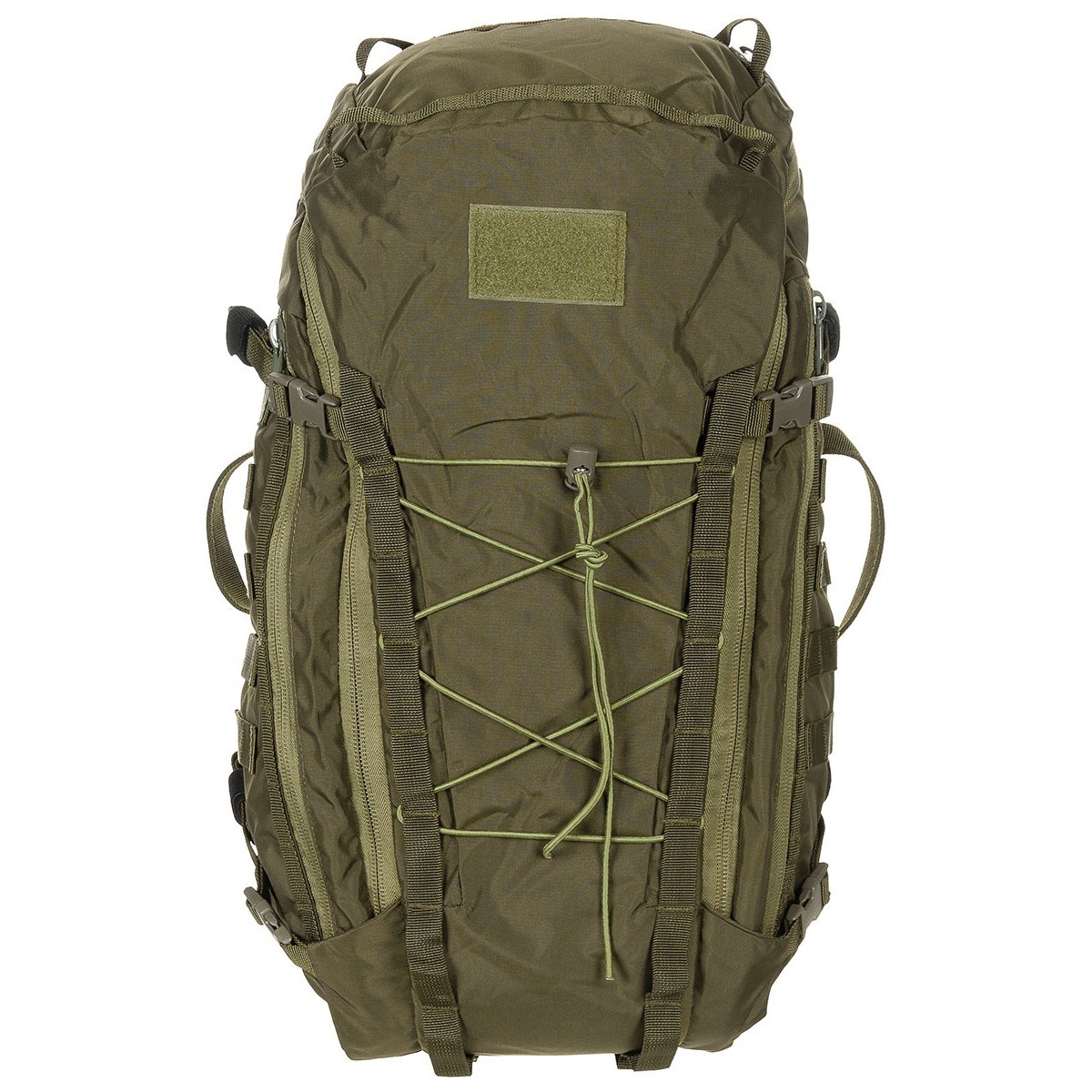 Les bretelles sont réglables en longueur, légèrement incurvées, équipées de deux passants pour le tuyau d'une poche à eau et d'une sangle pectorale avec boucle en plastique. La ceinture est composée d'une sangle et d'une boucle en plastique. Sur les côtés et sur le dessus, vous trouverez des poignées pour faciliter le transport du sac à dos. Sur les côtés, vous trouverez des sangles de compression et des poches accessibles par des fermetures éclair. La face avant est équipée d'une bande Velcro et d'un cordon élastique permettant de fixer, par exemple, une veste coupe-vent. Dans la partie supérieure du rabat, vous trouverez une poche adaptée au rangement de petits équipements. Le compartiment principal est accessible par une fermeture éclair à double sens. À l'intérieur, vous trouverez plusieurs boucles en sangle, un petit mousqueton en plastique pour accrocher une poche à eau et plusieurs bandes de molleton doux. Celui-ci sert principalement à fixer les étuis MISSION vendus séparément, mais peut également être utilisé pour d'autres équipements fixés à l'aide de la partie crochet du velcro.