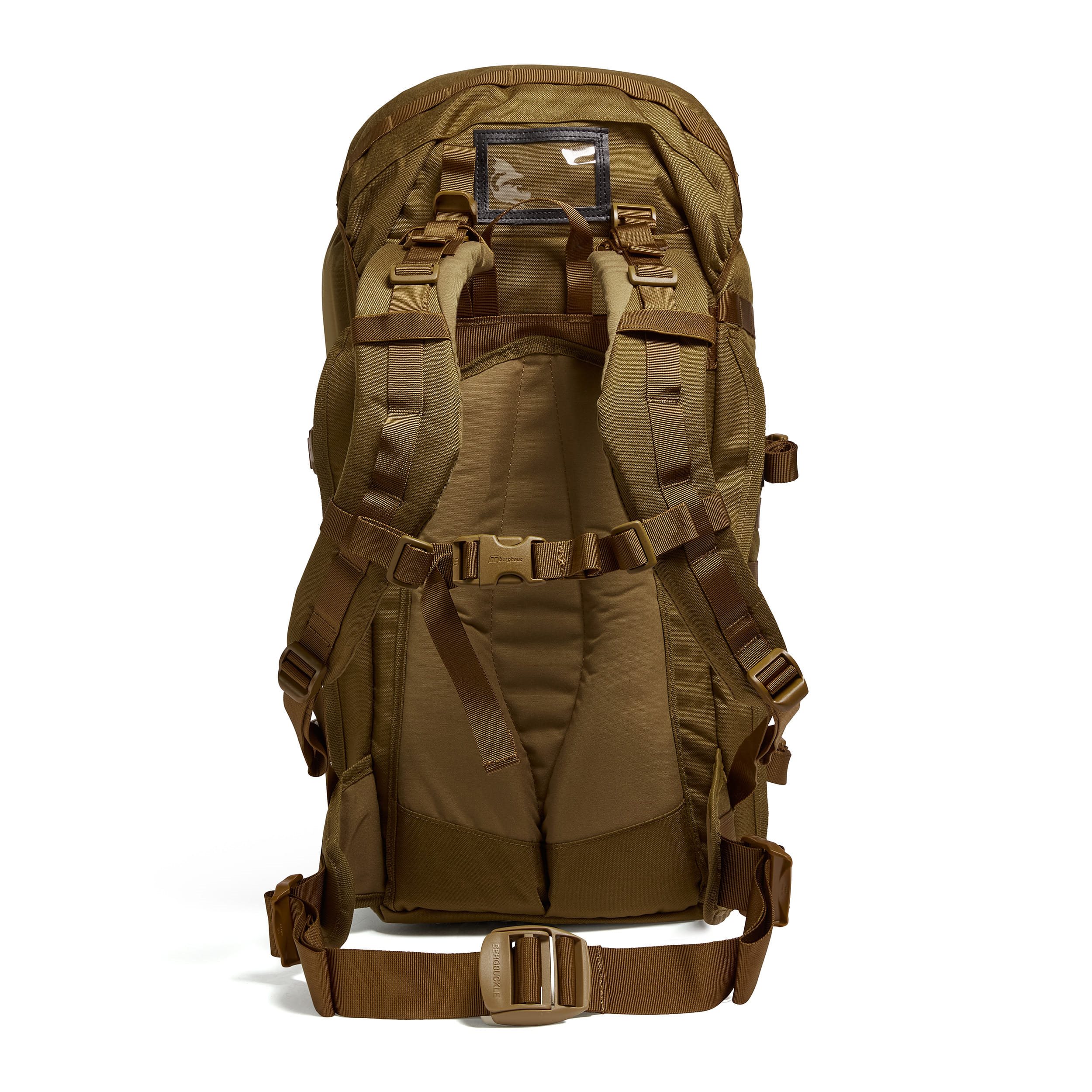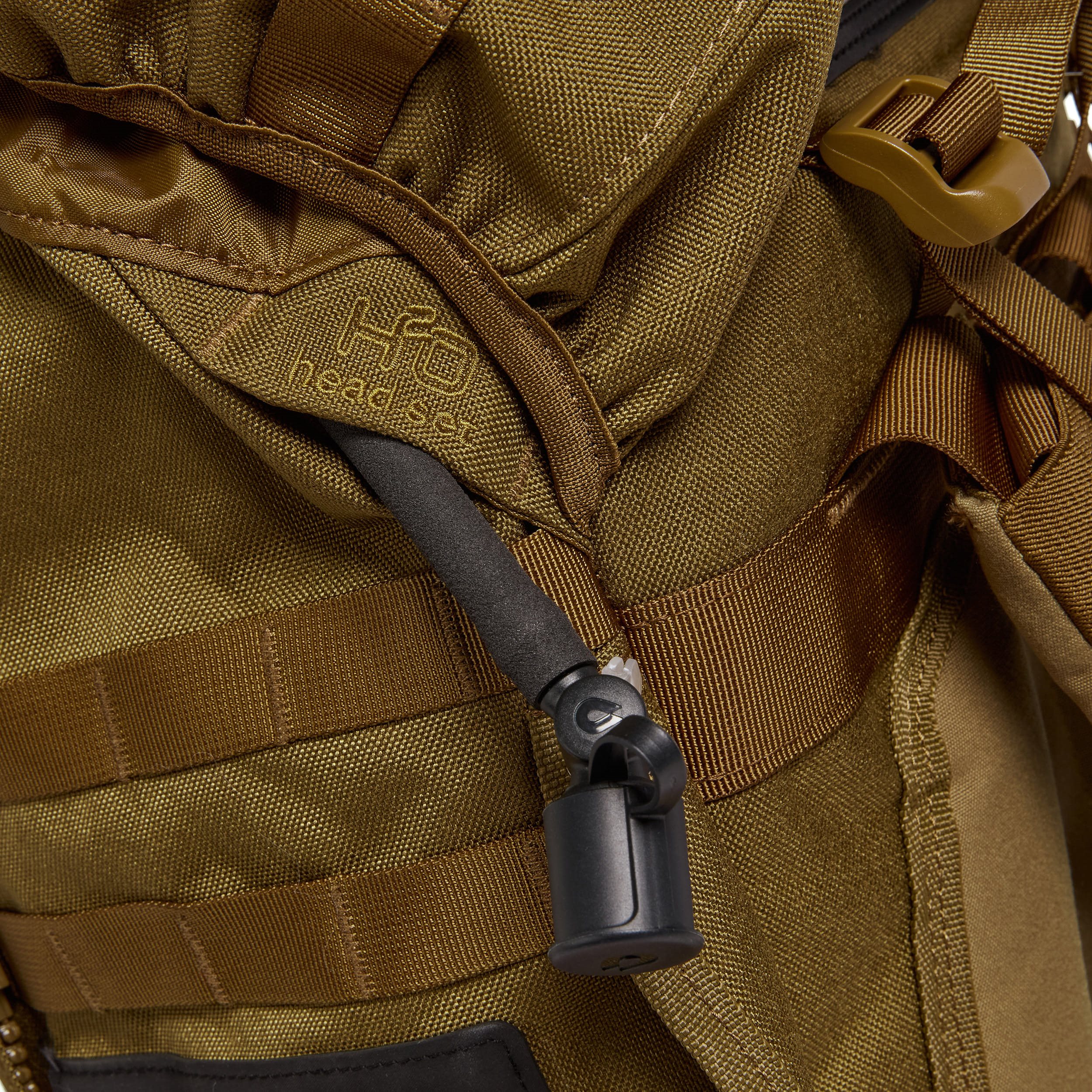 Les bretelles sont fortement rembourrées, réglables en hauteur, anatomiquement incurvées, équipées de sangles de stabilisation, de passages pour le tuyau de la poche à eau et d'une sangle thoracique élastique qui peut être réglée en hauteur dans trois fentes. La ceinture lombaire est légèrement rembourrée dans la partie étroite du sac à dos et se ferme à l'aide d'une boucle en plastique Bergbuckle. Le dos est renforcé par une structure en aluminium résistante et fortement rembourrée de mousse. Au-dessus des sangles, vous trouverez une poignée de transport simple et une fenêtre en mica destinée à vos étiquettes nominatives. Sur les côtés, vous trouverez des ouvertures pour passer le tuyau d'une poche à eau, plusieurs rangées de sangles modulaires standard MOLLE/PALS et deux sangles de compression servant à fixer des équipements supplémentaires. Si nécessaire, vous pouvez utiliser les fermetures éclair latérales pour fixer des équipements compatibles de la gamme MMPS.