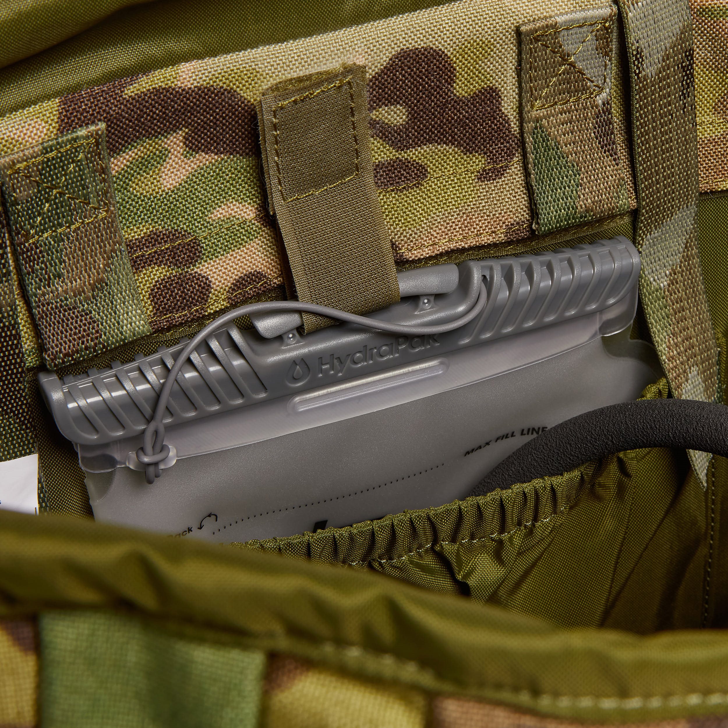 Les bretelles sont fortement rembourrées, réglables en hauteur, anatomiquement incurvées, équipées de sangles de stabilisation, de passages pour le tuyau de la poche à eau et d'une sangle thoracique élastique qui peut être réglée en hauteur dans trois fentes. La ceinture lombaire est légèrement rembourrée dans la partie étroite du sac à dos et se ferme à l'aide d'une boucle en plastique Bergbuckle. Le dos est renforcé par une structure en aluminium résistante et fortement rembourrée de mousse. Au-dessus des sangles, vous trouverez une poignée de transport simple et une fenêtre en mica destinée à vos étiquettes nominatives. Sur les côtés, vous trouverez des ouvertures pour passer le tuyau d'une poche à eau, plusieurs rangées de sangles modulaires standard MOLLE/PALS et deux sangles de compression servant à fixer des équipements supplémentaires. Si nécessaire, vous pouvez utiliser les fermetures éclair latérales pour fixer des équipements compatibles de la gamme MMPS.