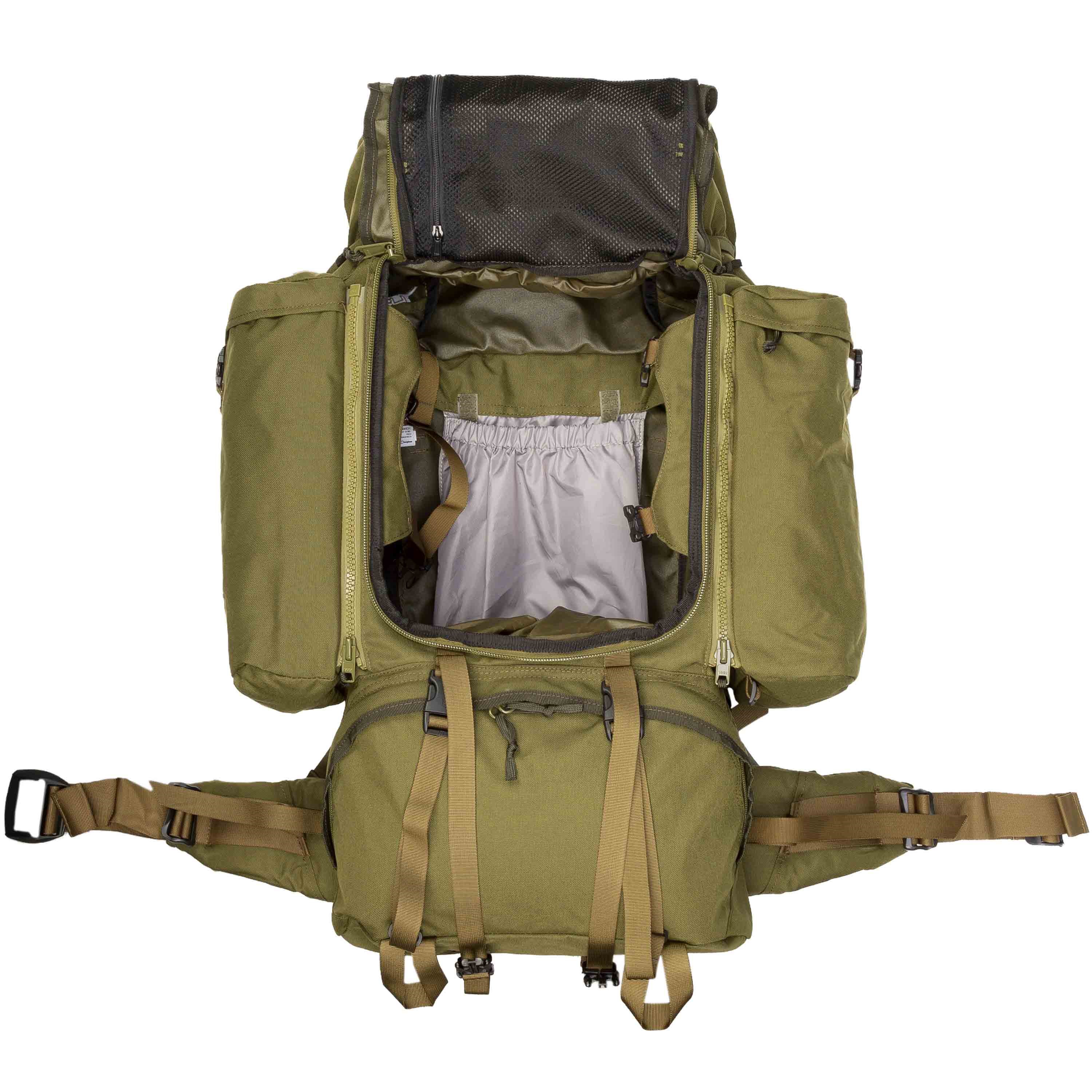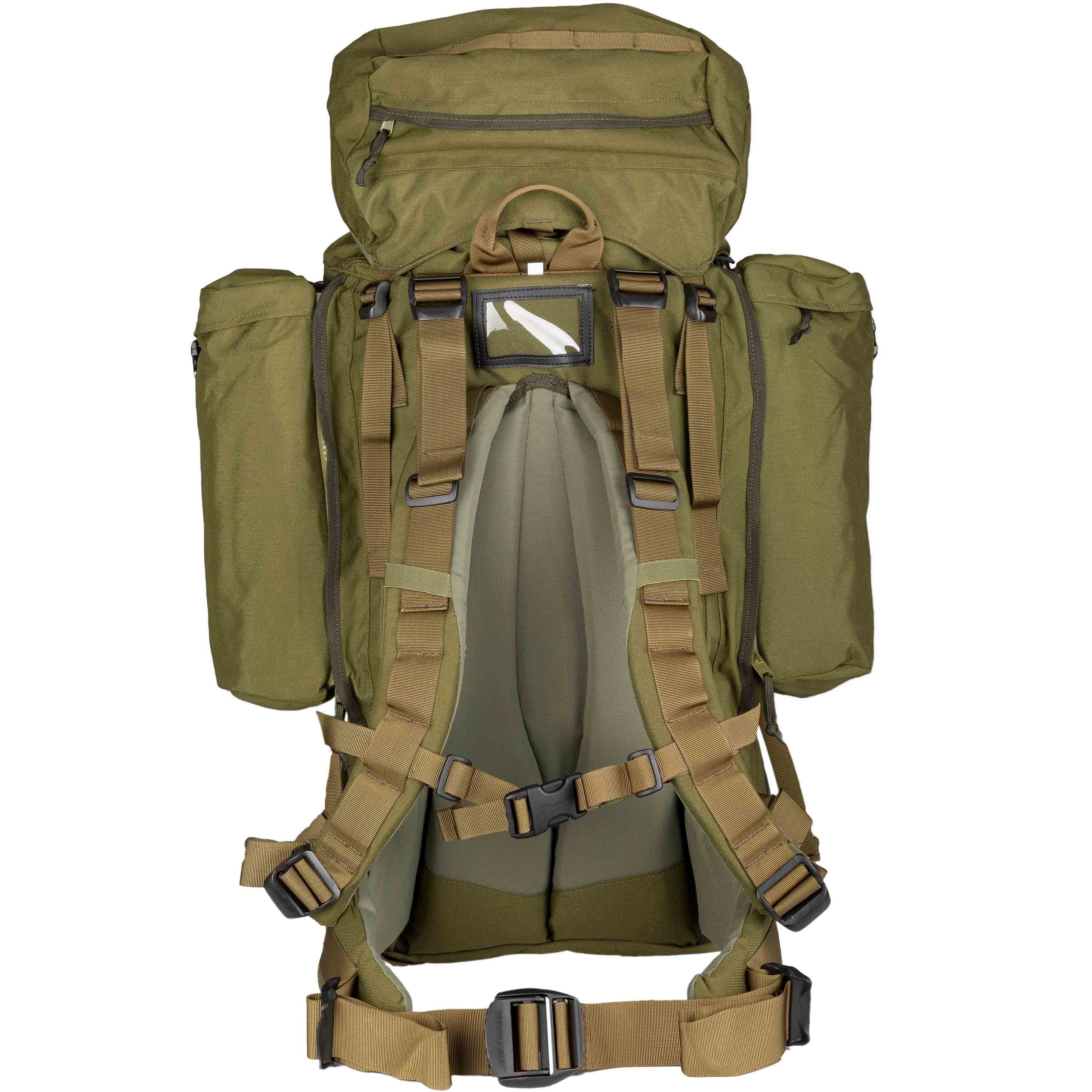 Les côtés du sac à dos sont équipés de deux poches MMPS de 10 litres qui, grâce à leurs fermetures éclair, peuvent être facilement détachées et utilisées séparément. Sous les poches, vous trouverez deux sangles de compression servant à fixer d'autres équipements plus volumineux (haches, etc.).