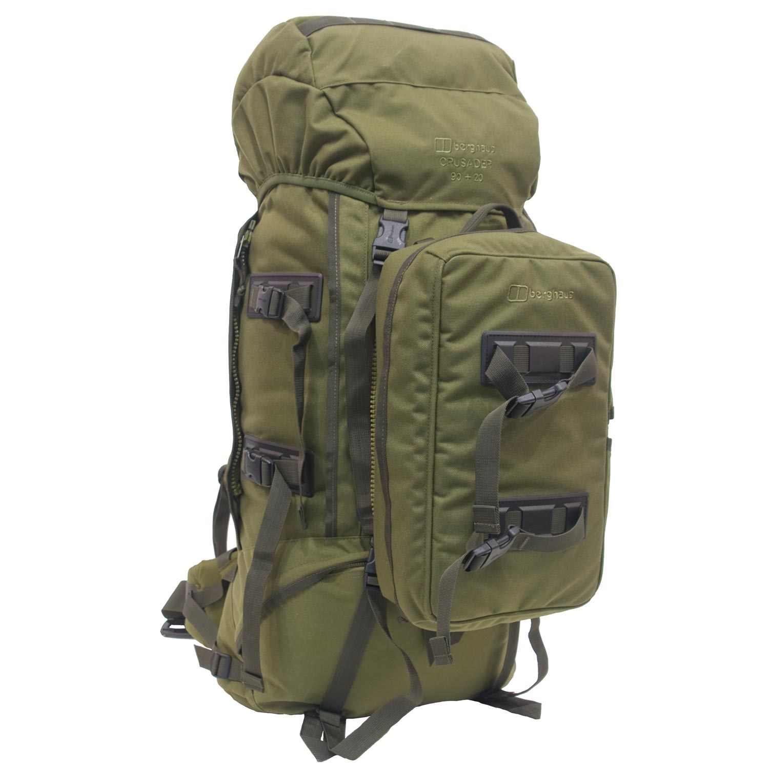 Grand sac à dos d'expédition de la série MMPS Berghaus Crusader III d'une capacité de 90 + 20 litres, de conception militaire robuste typique, avec une série d'améliorations modernes. Il s'agit du produit phare de la gamme militaire de sacs à dos Berghaus.