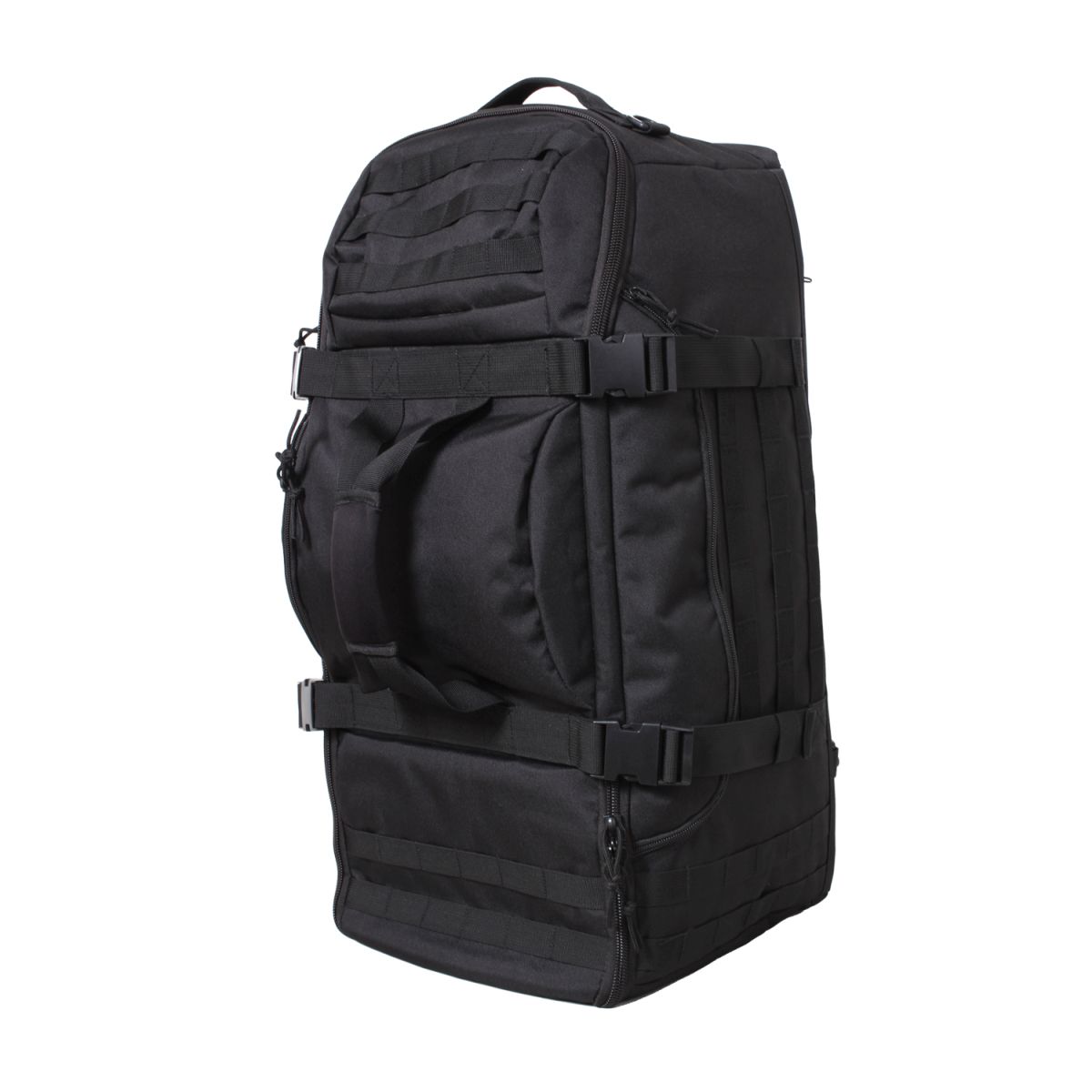 La poche principale s'ouvre à l'aide d'une fermeture éclair qui fait presque tout le tour et permet ainsi d'accéder facilement aux affaires rangées. Les curseurs de la fermeture éclair sont munis d'œillets qui permettent de passer un petit cadenas pour plus de sécurité. La poche principale peut être divisée en trois compartiments séparés à l'aide de deux panneaux et de fermetures éclair. Au milieu, vous trouverez une sangle avec une boucle en plastique qui vous permettra de mieux fixer les affaires dans le sac. À l'intérieur du rabat, il y a deux poches plates en filet avec fermeture éclair. Sur la face extérieure du rabat, en plus de la poignée pour transporter le sac, il y a 2 + 3 rangées de sangles MOLLE et une autre poche à double fermeture éclair. Celle-ci est idéale pour les affaires. l'extérieur du rabat, outre la poignée pour transporter le sac, se trouvent 2 + 3 rangées de sangles MOLLE et une autre poche à double fermeture éclair. Celle-ci est idéale pour les objets que vous devez garder à portée de main : billets d'avion, papiers, portefeuille, mais aussi une bouteille d'un litre. Sur les côtés du sac, il y a une poche à fermeture éclair de chaque côté et à l'intérieur, il y a encore un autre compartiment plat en filet sans fermeture. Sur les poches, il y a 3 autres rangées de sangles.