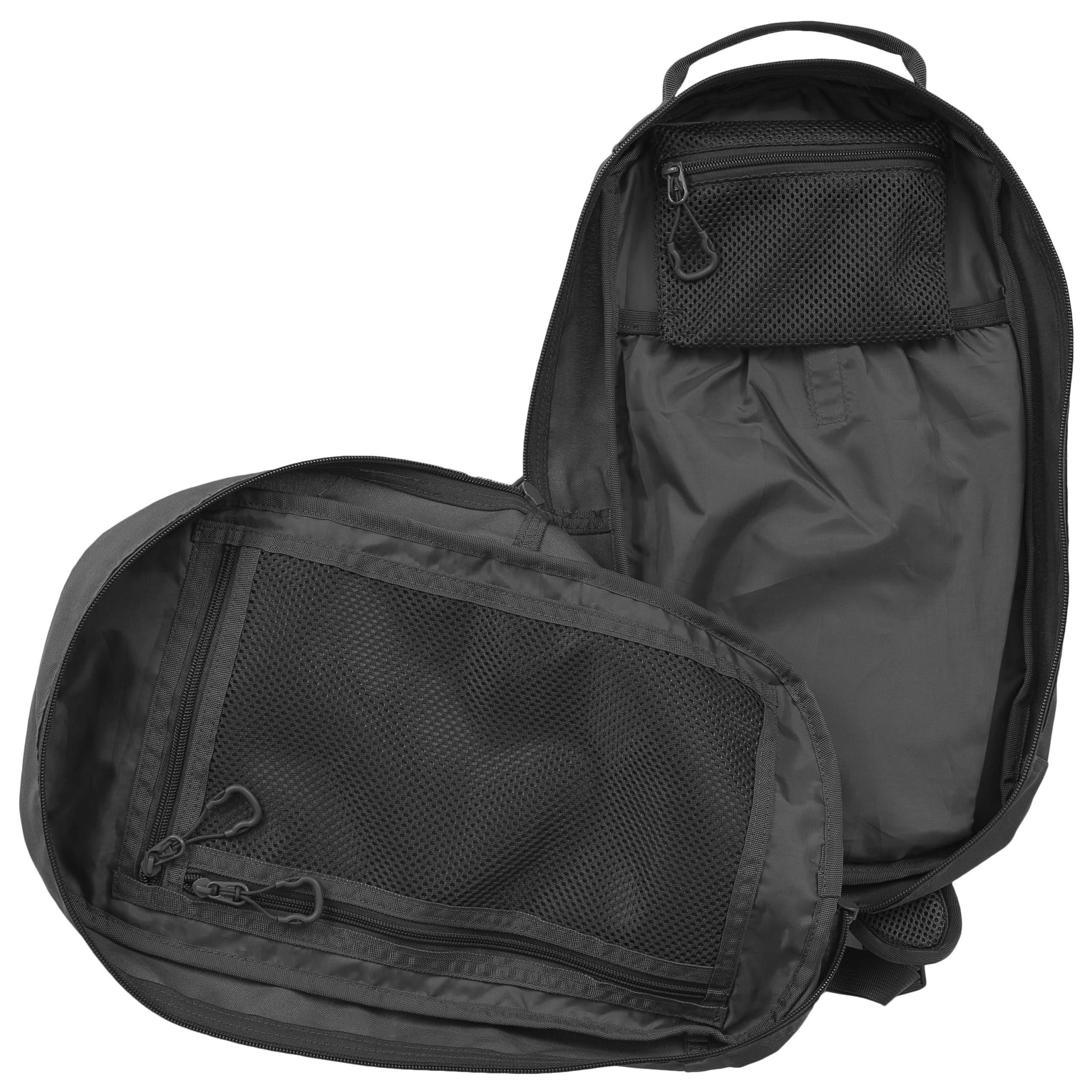 Le dos du sac à dos est généreusement rembourré avec une maille 3D. La bandoulière est réglable, équipée d'un triangle en plastique et d'une petite sangle de stabilisation réglable en hauteur et fermée par une boucle. Sur les côtés du sac à dos, vous trouverez des poches élastiques pour les bouteilles et les petits équipements. La partie supérieure est équipée d'une poignée de transport. À l'avant, vous trouverez deux rangées de sangles MOLLE/PALS, deux panneaux VELCRO et une poche supérieure pour les documents. Le compartiment principal est accessible par une fermeture éclair à double sens. À l'intérieur, vous trouverez une petite poche amovible, un compartiment avec un bord élastique pour une poche à eau et une grande poche en maille.