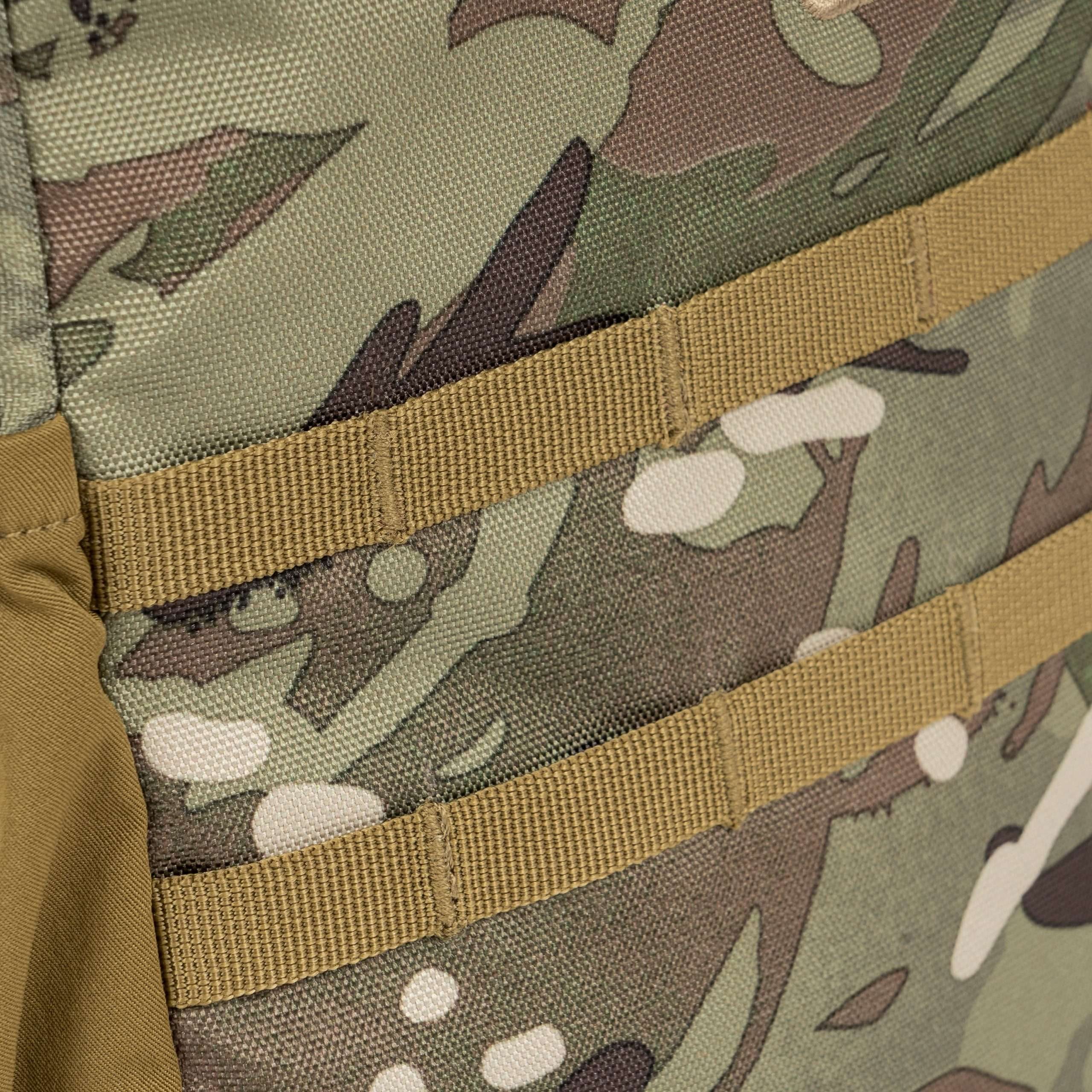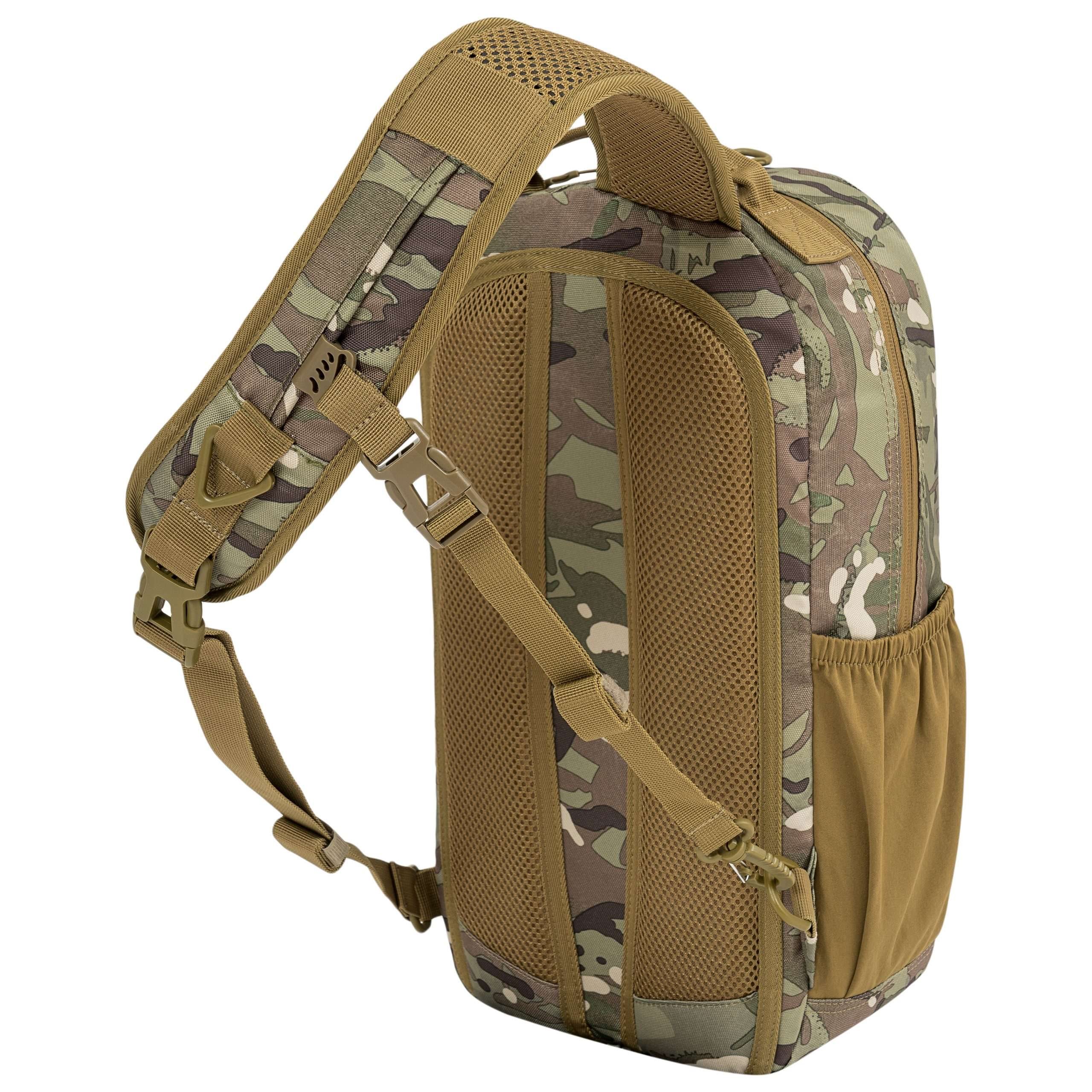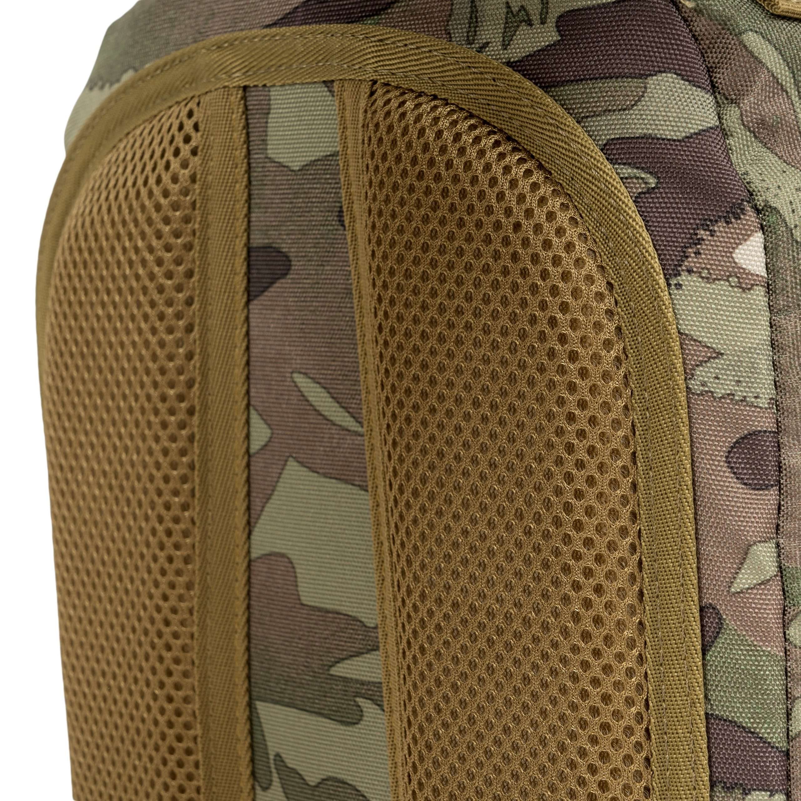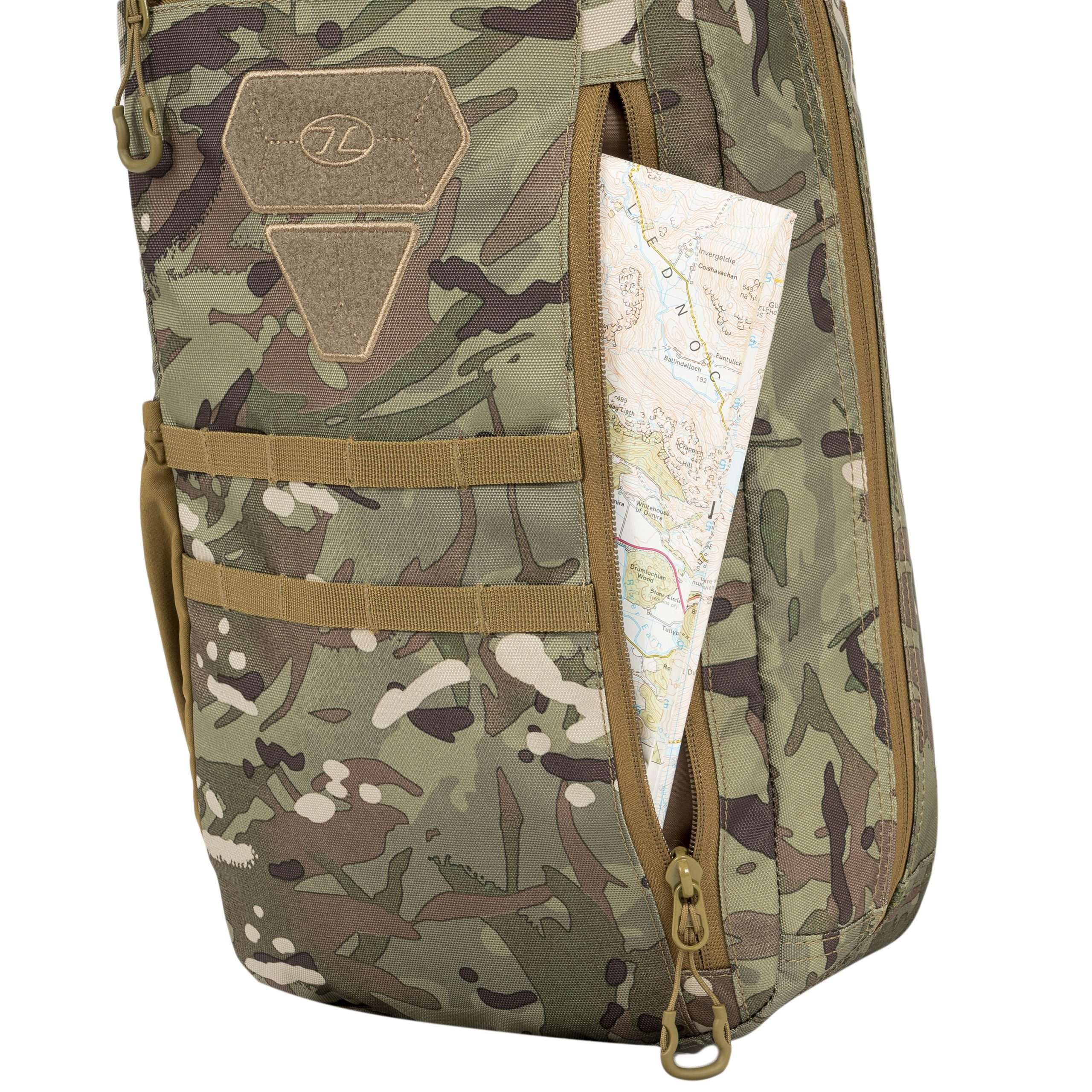 Le dos du sac à dos est généreusement rembourré avec une maille 3D. La bandoulière est réglable, équipée d'un triangle en plastique et d'une petite sangle de stabilisation réglable en hauteur et fermée par une boucle. Sur les côtés du sac à dos, vous trouverez des poches élastiques pour les bouteilles et les petits équipements. La partie supérieure est équipée d'une poignée de transport. À l'avant, vous trouverez deux rangées de sangles MOLLE/PALS, deux panneaux VELCRO et une poche supérieure pour les documents. Le compartiment principal est accessible par une fermeture éclair à double sens. À l'intérieur, vous trouverez une petite poche amovible, un compartiment avec un bord élastique pour une poche à eau et une grande poche en maille.