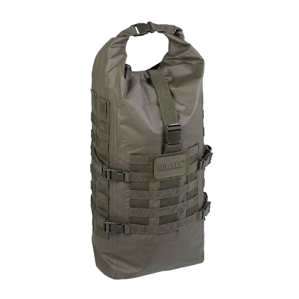Sac à dos imperméable de la marque allemande MIL-TEC, fabriqué à partir d'une combinaison de PVC et de polyester. Le sac à dos a une capacité de 35 litres et, grâce à sa couche protectrice, il peut protéger son contenu de l'eau même en cas d'immersion brève.