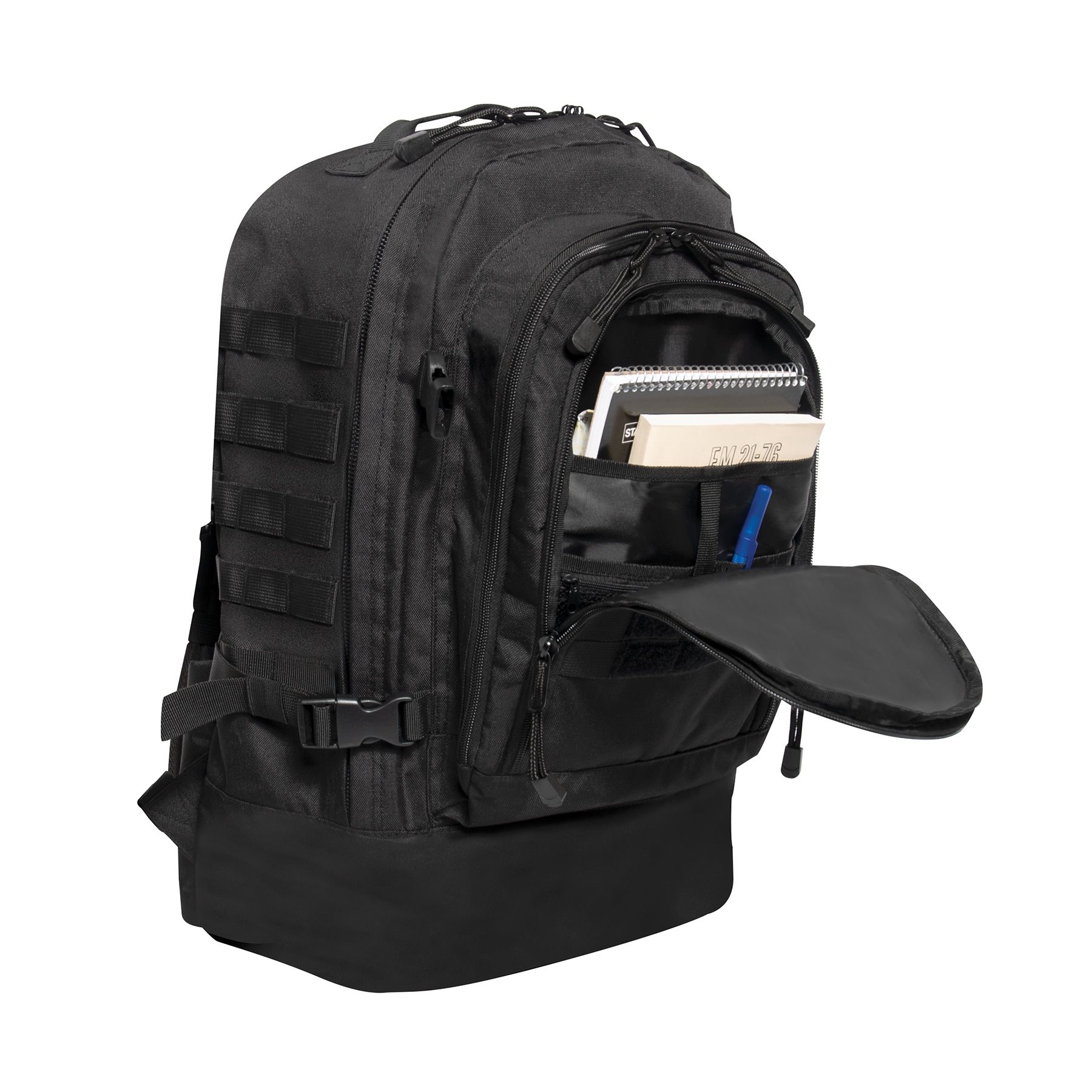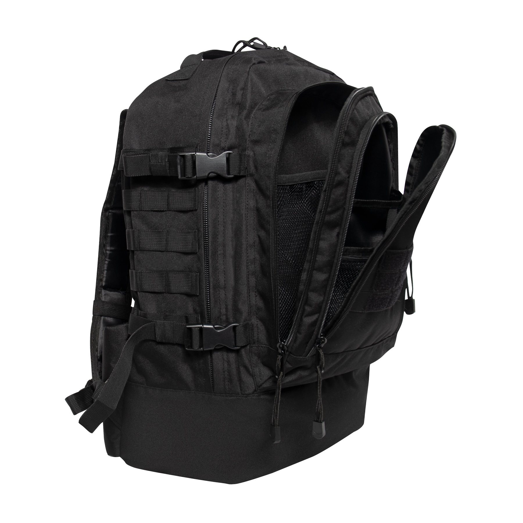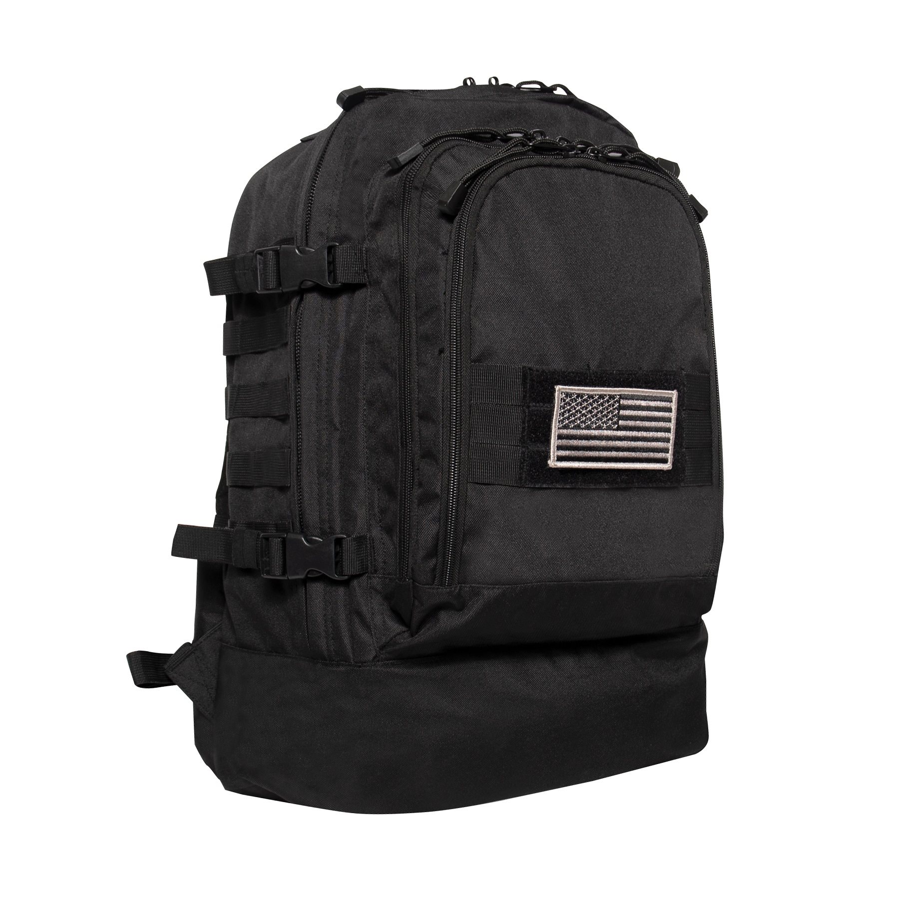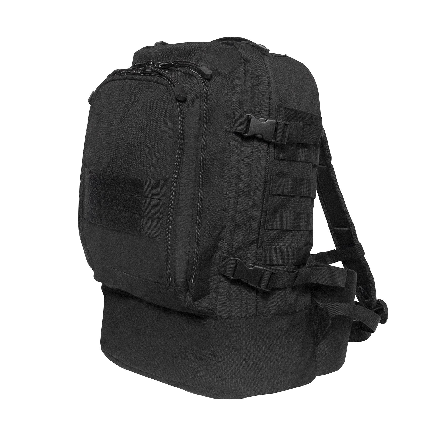 Sac à dos tactique de trois jours inspiré des sacs à dos d'assaut éprouvés. Ce sac à dos offre une conception discrète avec un volume relativement élevé, ce qui sera apprécié par les randonneurs, les aventuriers, les agents de sécurité, etc. Il est doté d'un dos rembourré, de bretelles réglables en taille, complétées par une ceinture rembourrée à boucle Fastex. Sur les côtés, vous trouverez une paire de sangles de compression et un système d'attache MOLLE/PALS pour fixer des équipements compatibles. À l'avant du sac à dos se trouve un système d'attache MOLLE/PALS avec velcro pour vos écussons VELCRO. L'espace de rangement du sac à dos est divisé en trois compartiments. Le premier compartiment avant dispose de deux poches et d'une poche en filet. Dans le deuxième compartiment, vous trouverez une poche en filet relativement grande. Le compartiment principal n'est pas divisé, mais il est recouvert d'un revêtement en PVC. Les compartiments sont accessibles grâce à des fermetures éclair à double sens.