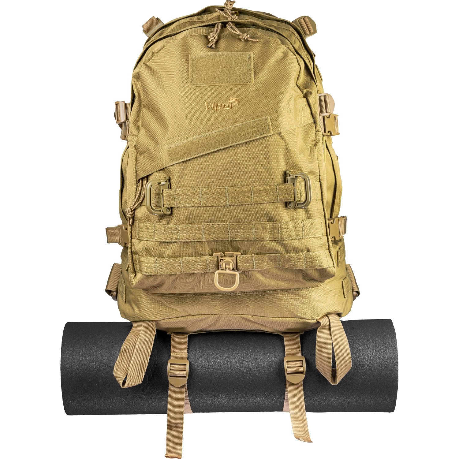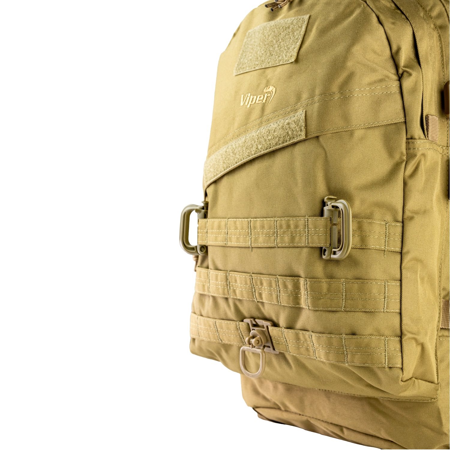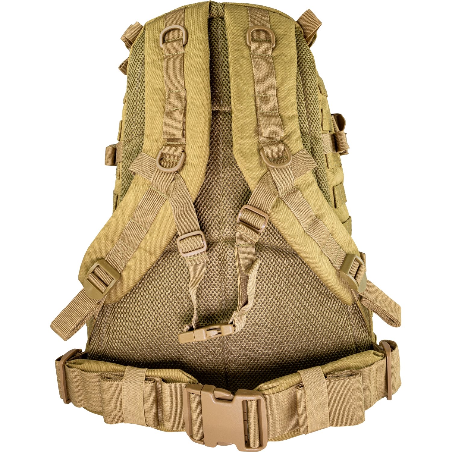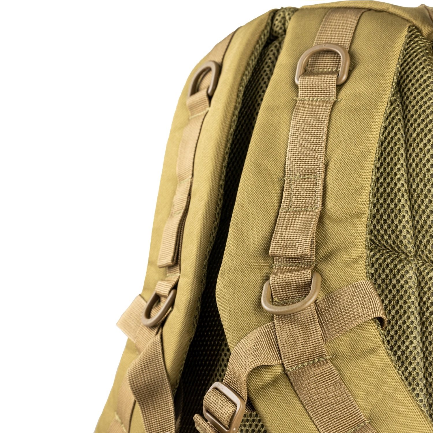 Les anneaux en D et les mousquetons qui font partie du sac à dos élargissent ses propriétés utilitaires. Les sangles MOLLE permettent d'attacher d'autres équipements, dont une liaison MOLLE/PALS. Les sangles latérales réglables servent de compression ou aident à transporter un matelas, une veste, etc. Trois poches à fermeture éclair - principale, centrale et avant.