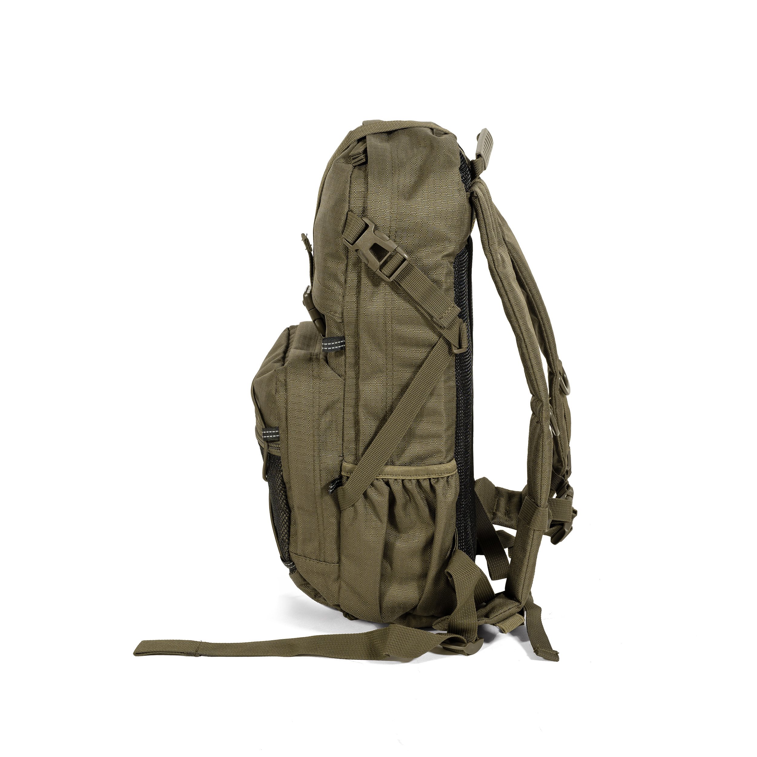 Les bretelles sont légèrement incurvées, réglables en longueur et disposent d'une sangle pectorale à boucle. Le dos est rembourré et comporte une poignée pratique pour le transport dans sa partie supérieure. Les côtés sont équipés d'une sangle de compression à boucle et de poches pour une bouteille d'eau ou de petits objets. La poche avant décalée dispose d'un compartiment plat en filet et d'un cordon élastique avec possibilité de serrage. Derrière la poche avant, vous trouverez un petit compartiment plat accessible par une fermeture éclair. Le compartiment principal est accessible par une fermeture éclair à double sens recouverte d'un rabat. La fermeture éclair est également sécurisée à l'avant par une sangle avec boucle en plastique.