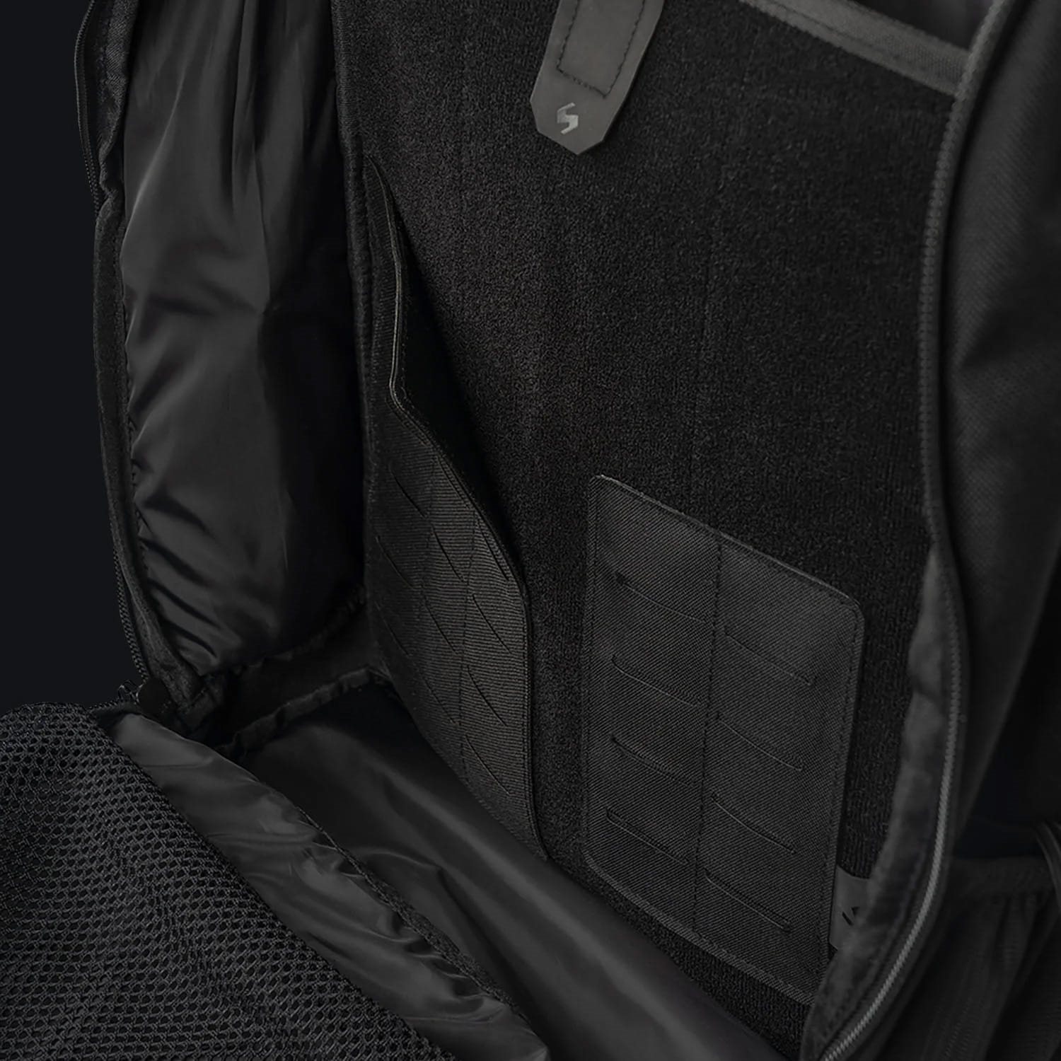 La face avant du sac à dos est équipée de deux poches décalées accessibles par des fermetures éclair à double sens. La poche supérieure décalée est renforcée pour conserver sa forme et est doublée à l'intérieur d'un molleton doux. La poche inférieure décalée contient un petit organiseur, sa partie extérieure est cousue avec une liaison modulaire standard MOLLE/PALS combinée à du velcro. Le compartiment principal est accessible par une fermeture éclair à double sens. À l'intérieur, vous trouverez deux poches en filet, deux panneaux amovibles avec une fixation modulaire et un compartiment rembourré pour un ordinateur portable ou une poche à eau d'une capacité de trois litres. Dans la partie supérieure du compartiment principal, il y a des passe-câbles pour le câblage ou le tuyau de la poche à eau.