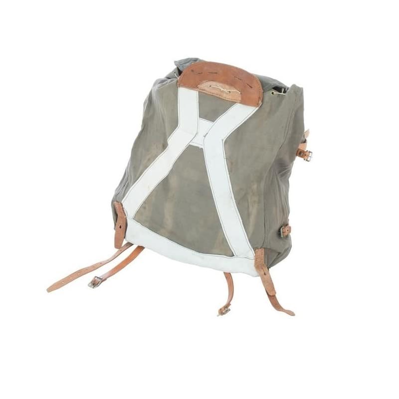 Sac à dos en toile M39. Fermeture par boucles en cuir à enfiler. Dimensions : 45 x 53 x 17 cm. Plus d'informations
