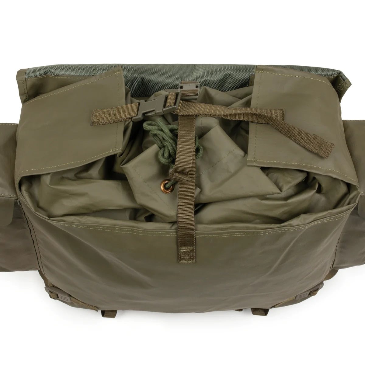Sac à dos en caoutchouc et textile d'origine de l'armée suisse. Compartiment principal avec rabat à cordon, deux poches latérales fermées par des rabats avec boucles en plastique, support frontal pour casque, poignée de transport. Le dos est renforcé par deux renforts verticaux et un renfort horizontal en aluminium. Partie inférieure rembourrée. Le sac à dos n'est pas équipé de bretelles.