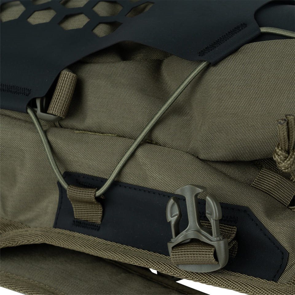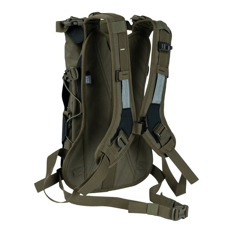 Les bretelles sont réglables en longueur, anatomiques, équipées d'une sangle réglable en hauteur et d'une boucle pour fixer le tuyau de la poche à eau. Le sac à dos est équipé d'une ceinture simple avec une boucle en plastique. Le dos est légèrement rembourré et sa partie supérieure est dotée d'une poignée de transport. La face avant du sac à dos est équipée d'un panneau hexagonal pour fixer des équipements supplémentaires. L'espace de rangement du sac à dos est divisé en deux compartiments séparés. Le compartiment arrière est destiné au transport de la poche à eau fournie, tandis que le compartiment avant est idéal pour ranger de petits équipements, de la nourriture ou des vêtements.