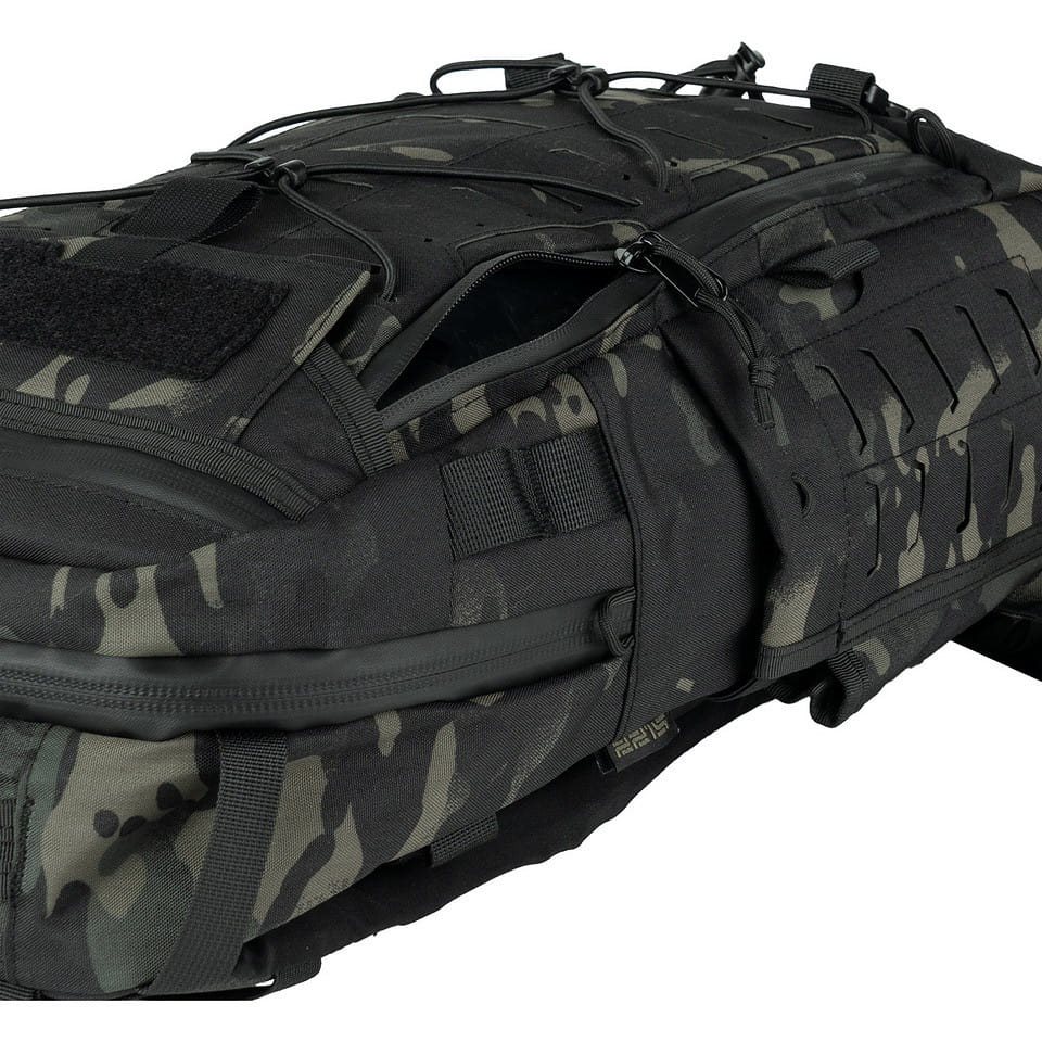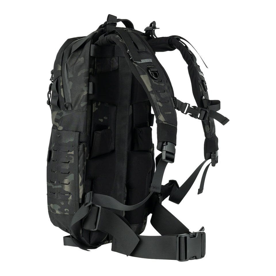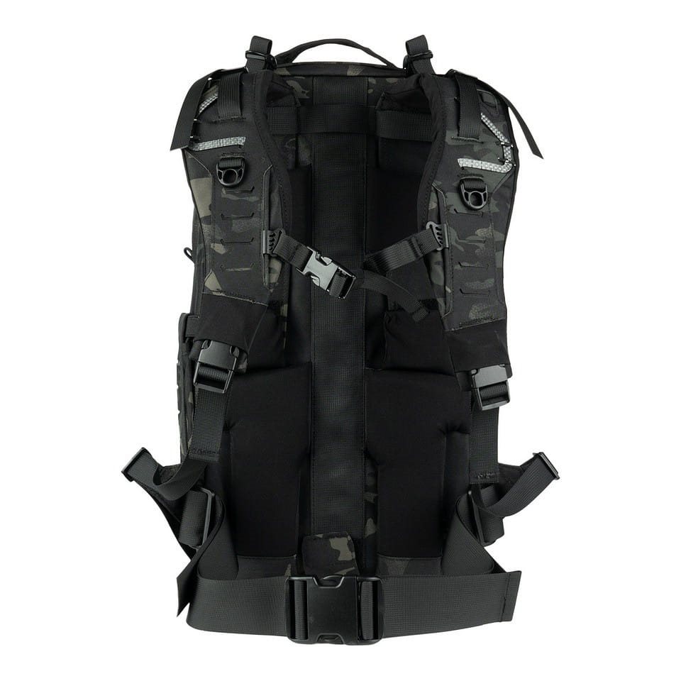 Les bretelles réglables en hauteur sont assez rembourrées, équipées d'un système de dégagement rapide, de sangles de stabilisation et d'une sangle thoracique élastique réglable en hauteur. Le dos est renforcé par une tige en aluminium et, dans sa partie inférieure, vous trouverez une sangle lombaire fermée par une boucle en plastique. Sur les côtés se trouvent des poches pour bouteilles pouvant contenir une grande bouteille en plastique ou une bouteille d'un litre de type Nalgene. Les parties supérieure et inférieure du sac à dos sont équipées de poignées pour faciliter le transport. Le rabat avant est recouvert d'une bande MOLLE/PALS laser et comporte un cordon élastique avec possibilité de serrage. La poche avant supérieure fermée par une fermeture éclair est recouverte à l'extérieur de velcro pour permettre la personnalisation à l'aide d'écussons ou d'étiquettes.