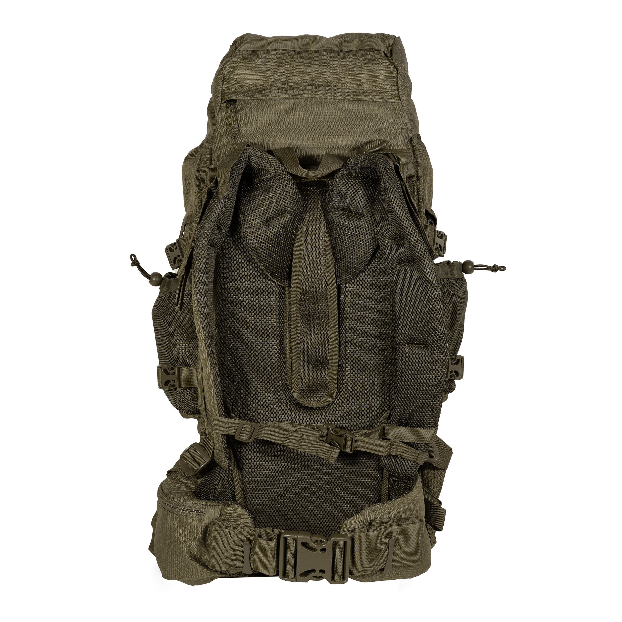 Sac à dos d'expédition à deux compartiments avec accès par le haut, le bas et le côté. L'accès par le haut est assuré par un rabat avec une poche extérieure et intérieure spacieuse et des attaches pour fixer l'équipement. L'accès par le bas est assuré par une fermeture éclair à double sens recouverte d'un rabat. Le compartiment principal est également accessible par une fermeture éclair verticale recouverte d'un rabat, située sous les sangles de compression. À l'intérieur du sac à dos, on trouve une petite poche zippée pour les objets de valeur, deux poches latérales pouvant accueillir par exemple des bouteilles PET de 1,5 l et un compartiment profond à l'arrière. L'espace intérieur du sac à dos peut être divisé en un compartiment supérieur et un compartiment inférieur à l'aide d'un rabat à fermeture éclair. Le sac à dos dispose de six poches latérales. Les plus grandes sont fermées par des fermetures éclair à double sens et peuvent contenir, par exemple, une bouteille Nalgene de 1 litre. Elles sont surmontées de poches en filet ouvertes sur le dessus. D'autres poches ouvertes se trouvent dans la partie inférieure du sac à dos et, combinées à des sangles de compression, peuvent être utilisées pour ranger des bâtons de randonnée ou d'autres objets de forme similaire. À l'avant, on trouve un laçage en cordon élastique. Derrière celui-ci se trouve un compartiment en filet ouvert sur le dessus, et enfin une grande poche plate accessible par une fermeture éclair verticale recouverte d'un rabat. Des boucles pour fixer les piolets sont également présentes. Le fond du sac à dos est équipé de passants et d'anneaux en D pour les sangles de fixation, et une petite poche contient une housse de pluie intégrée.