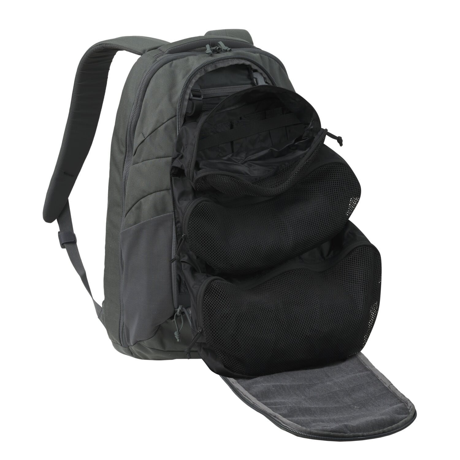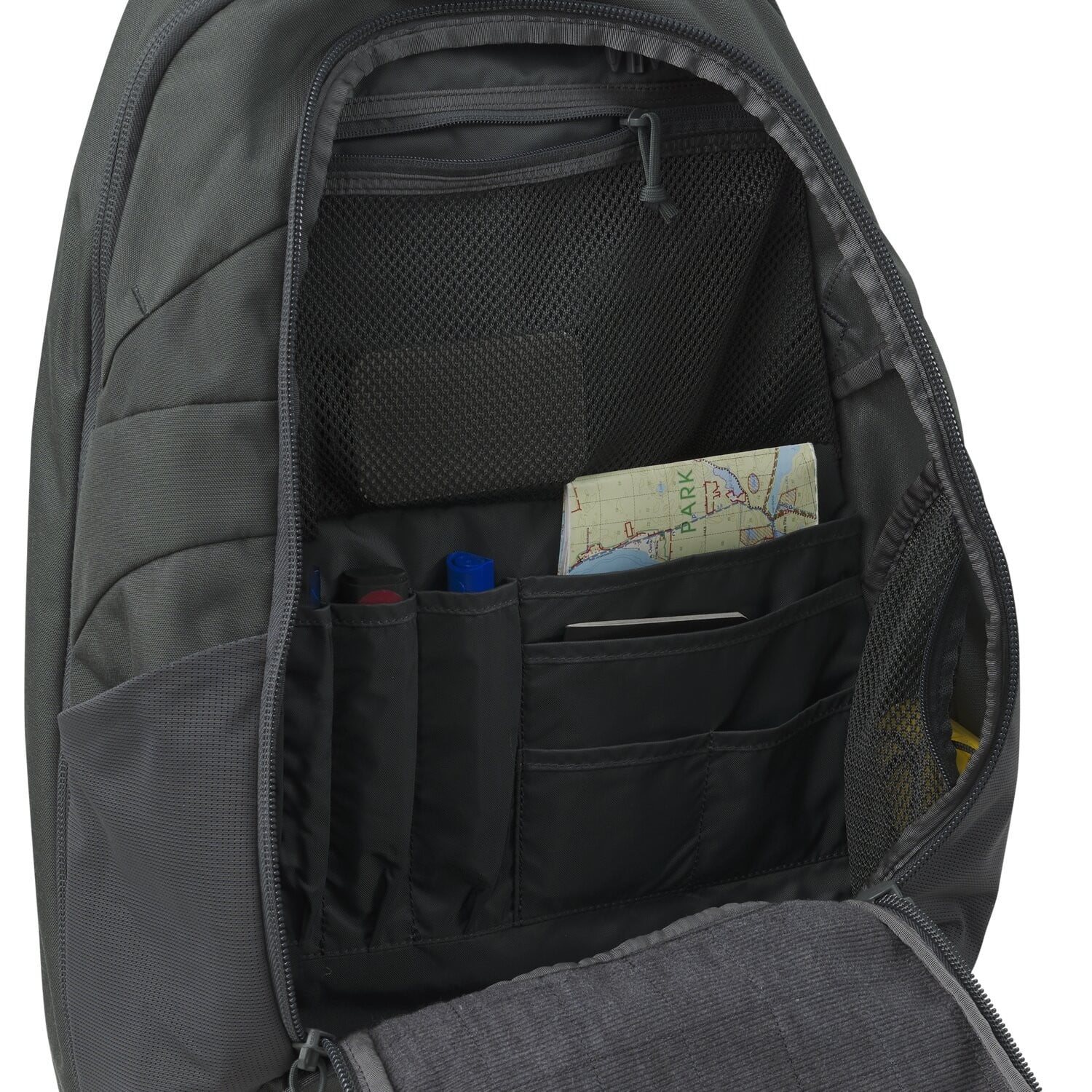 Le compartiment principal est divisé en deux poches accessibles par une fermeture éclair à double sens pouvant être verrouillée à l'aide d'un cadenas (non fourni). Le compartiment avant est muni d'un velours doux sur le rabat pour fixer des organiseurs avec du velcro, tandis que la partie arrière dispose d'une poche en filet, d'un petit organiseur pour les stylos et de compartiments plats. Le compartiment arrière dispose d'un compartiment sécurisé pour un ordinateur portable jusqu'à 15,6 pouces et d'un compartiment pour ranger par exemple un livre ou un carnet. La dernière poche en filet se trouve à l'avant du compartiment arrière.