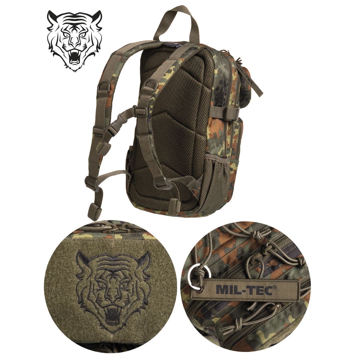 • Poche supérieure avant avec panneau velcro et tête de tigre