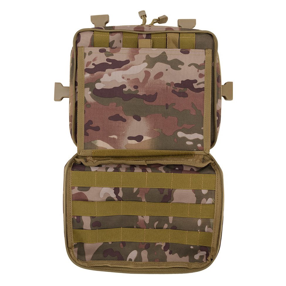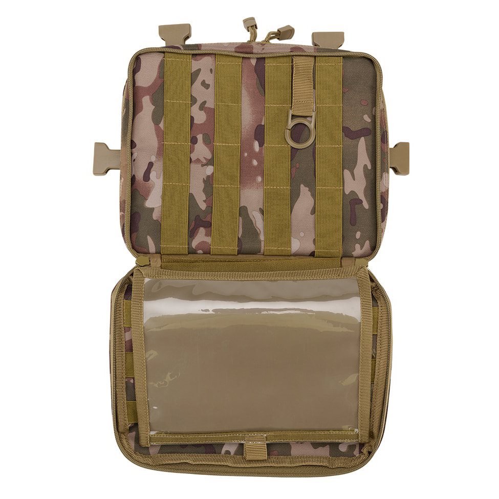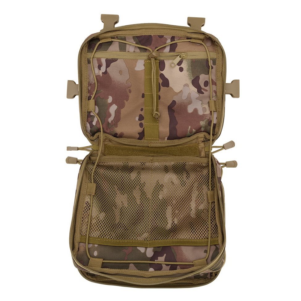 Les sangles de transport sont en forme de H et sont composées en partie d'une maille très respirante et légère et en partie de sangles classiques fixées à l'aide de quatre boucles FASTEX en plastique avec possibilité de retrait rapide. L'arrière du sac est très confortablement rembourré grâce à une maille 3D douce. La face avant est cousue de six rangées de sangles modulaires standard MOLLE/PALS. Les deux rangées supérieures sont en outre combinées avec du velcro. Vous pouvez ainsi facilement équiper le sac d'accessoires compatibles supplémentaires et le personnaliser à l'aide d'écussons et d'étiquettes à velcro. Au fond du sac, vous trouverez une petite poche en maille.