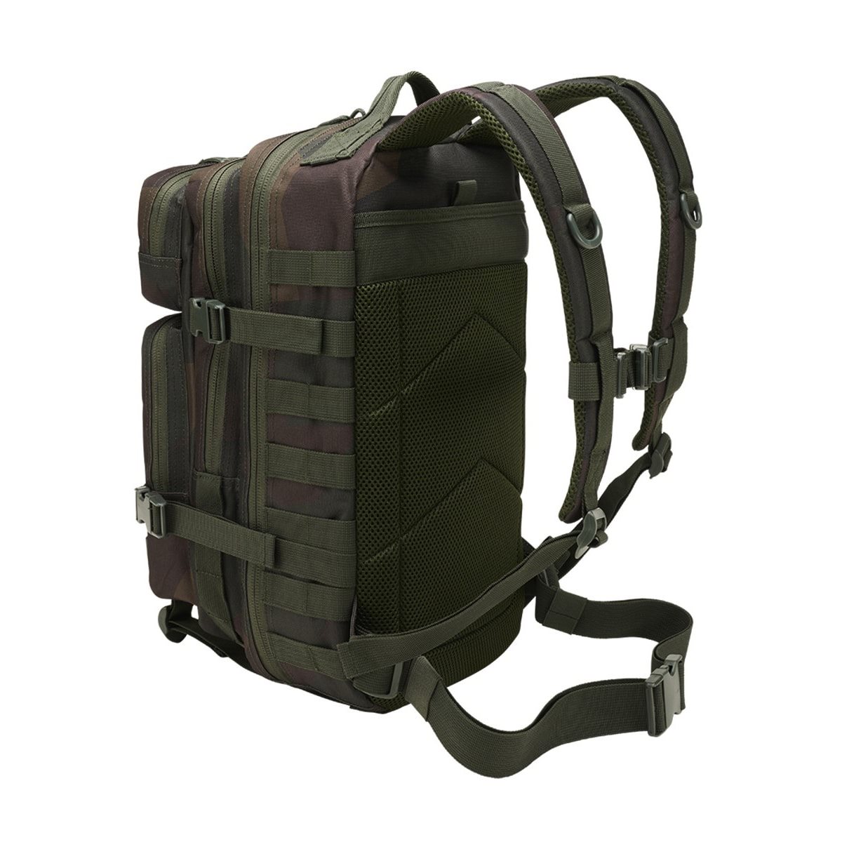 Le dos du sac à dos est légèrement rembourré, il comporte une poche pouvant accueillir une poche à eau et est muni d'une poignée dans sa partie supérieure pour faciliter le transport. Les bretelles sont réglables en hauteur, anatomiques, rembourrées, munies d'une maille 3D et d'une sangle thoracique élastique fermée par une boucle Fastex en plastique. La ceinture abdominale est simple et également fermée par une boucle Fastex. Sur les côtés du sac à dos se trouve un large système d'attache MOLLE/PALS permettant de fixer des pochettes compatibles et d'autres équipements. En plus du système d'attache, il y a également deux sangles de compression sur le côté.