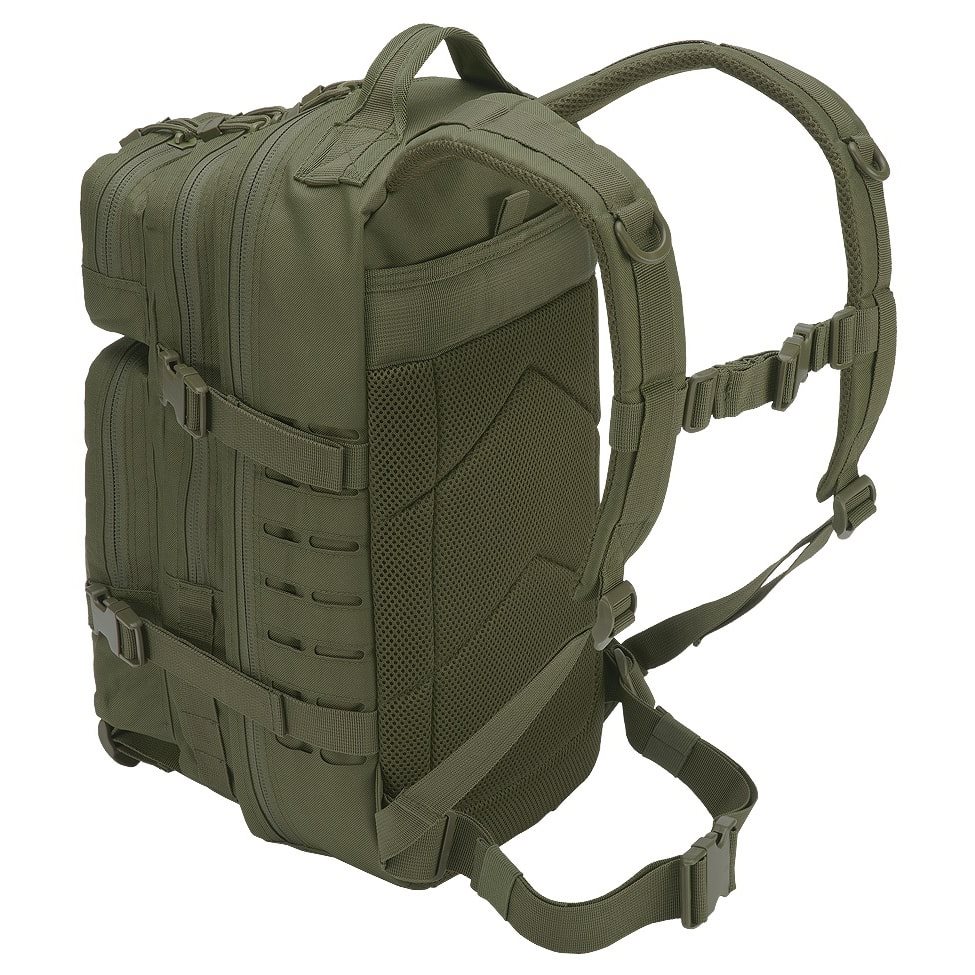 Le dos du sac à dos est légèrement rembourré, il comporte une poche pouvant accueillir une poche à eau et est muni d'une poignée dans sa partie supérieure pour faciliter le transport. Les bretelles sont réglables en hauteur, anatomiques, rembourrées, munies d'un filet 3D et d'une sangle thoracique élastique fermée par une boucle Fastex en plastique. La ceinture abdominale est simple et également fermée par une boucle Fastex. Sur les côtés du sac à dos se trouve un large système de fixation MOLLE/PALS découpé au laser, servant à fixer des pochettes compatibles et d'autres équipements. En plus du système de fixation, il y a également une paire de sangles de compression sur le côté.