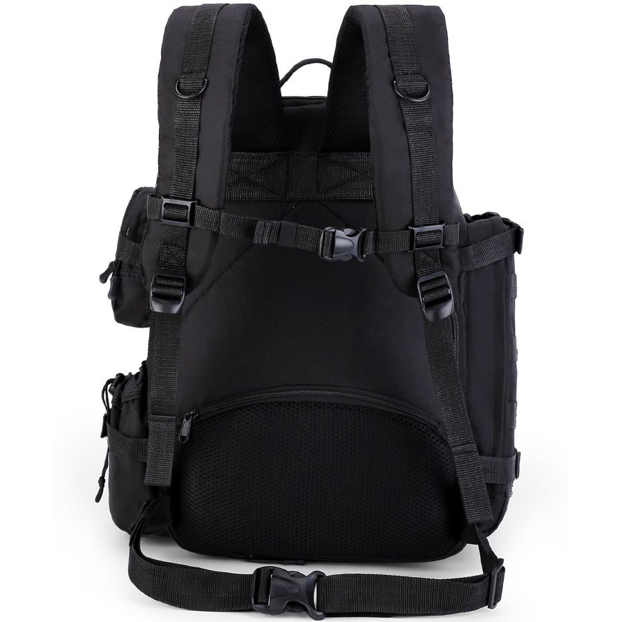 Les bretelles réglables en longueur sont rembourrées de maille 3D, équipées de sangles de stabilisation, d'anneaux en D en plastique et d'une sangle pectorale à boucle en plastique. Le dos est rembourré au niveau des hanches et la ceinture lombaire est constituée d'une simple sangle avec boucle. La partie supérieure du sac à dos est équipée d'une poignée de transport simple et d'une ouverture pour passer le tuyau d'une poche à eau. Sur les côtés, vous trouverez deux sangles de compression et trois poches au total, adaptées au rangement de petits équipements. À l'avant, il y a deux poches. La poche inférieure est cousue à l'extérieur avec une liaison modulaire combinée à des panneaux de velcro pour vos écussons VELCRO. À l'intérieur, il y a un séparateur avec des petits compartiments et un cordon avec un mousqueton en plastique. La poche supérieure est également cousue avec une bande MOLLE/PALS et du velcro, mais l'intérieur de la poche n'est pas divisé. Le compartiment principal comprend un compartiment élastique pour une poche à eau ou une petite tablette/un petit ordinateur portable et une petite poche avant en filet. Le fond du sac à dos est cousu avec une autre bande modulaire.