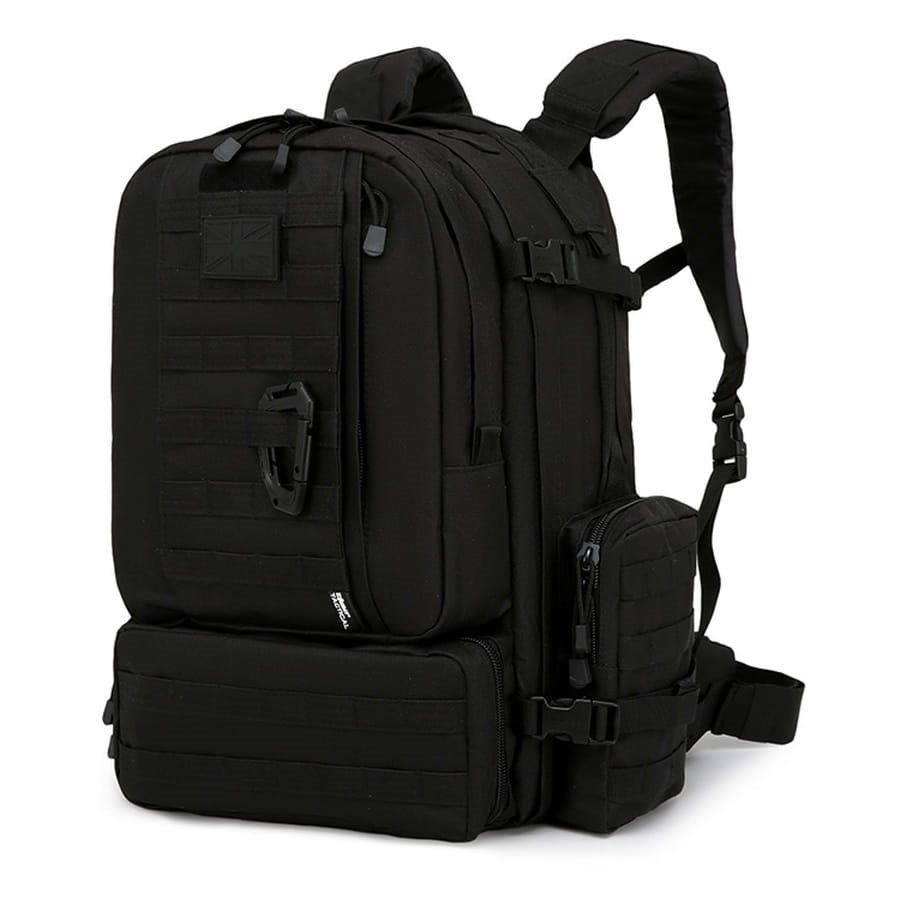 Sac à dos spacieux pour 3 jours avec sangles MOLLE sur les poches latérales et à l'avant. Dos rembourré avec aération, bretelles rembourrées, ceinture rembourrée amovible. Panneau Velcro. Matériau : 600D Tac-Poly. Plus d'informations