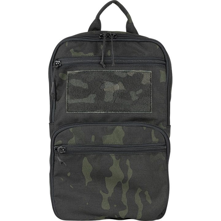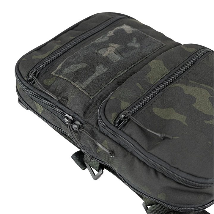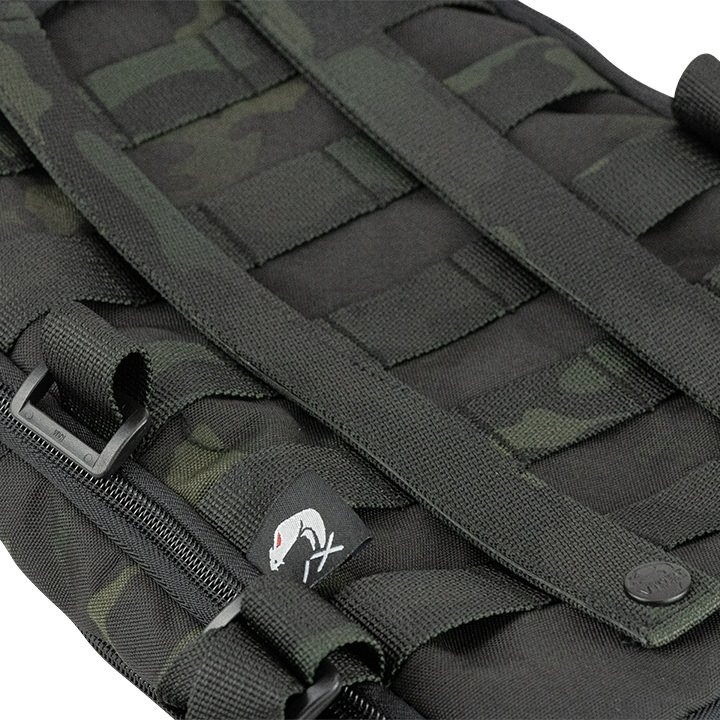 À l'avant du sac à dos, vous trouverez deux poches plates pour ranger les petits objets que vous souhaitez avoir à portée de main. Derrière les poches se trouvent deux compartiments extensibles de tailles différentes. Le plus grand compartiment peut facilement contenir une veste, des provisions pour la journée ou une poche à eau de deux litres. Le plus petit compartiment est idéal pour une trousse de premiers secours ou des outils d'orientation. Entre la grande et la petite poche, vous trouverez un grand panneau VELCRO pour vos écussons. L'arrière du sac à dos est recouvert d'un tissage MOLLE/PALS qui, tout comme les boucles FASTEX fournies, sert à la fixation au système VX. Les bretelles du sac à dos sont entièrement réglables et disposent de passages pour faire passer le tuyau de la poche à eau.