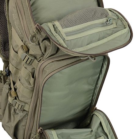 L'intérieur du sac à dos est conçu pour une visibilité maximale. Vous y trouverez deux poches pour les documents ou les ordinateurs portables, une poche en filet spacieuse, une fixation MOLLE pour attacher l'équipement tactique et une cloison amovible qui sépare le haut et le bas du sac à dos. Une poche pour la poche à eau Eberlestock, disponible en deux et trois litres, est également incluse. Le sac à dos est livré avec une sangle de transport et une sangle pour le fixer à un harnais. disponible en deux et trois litres.