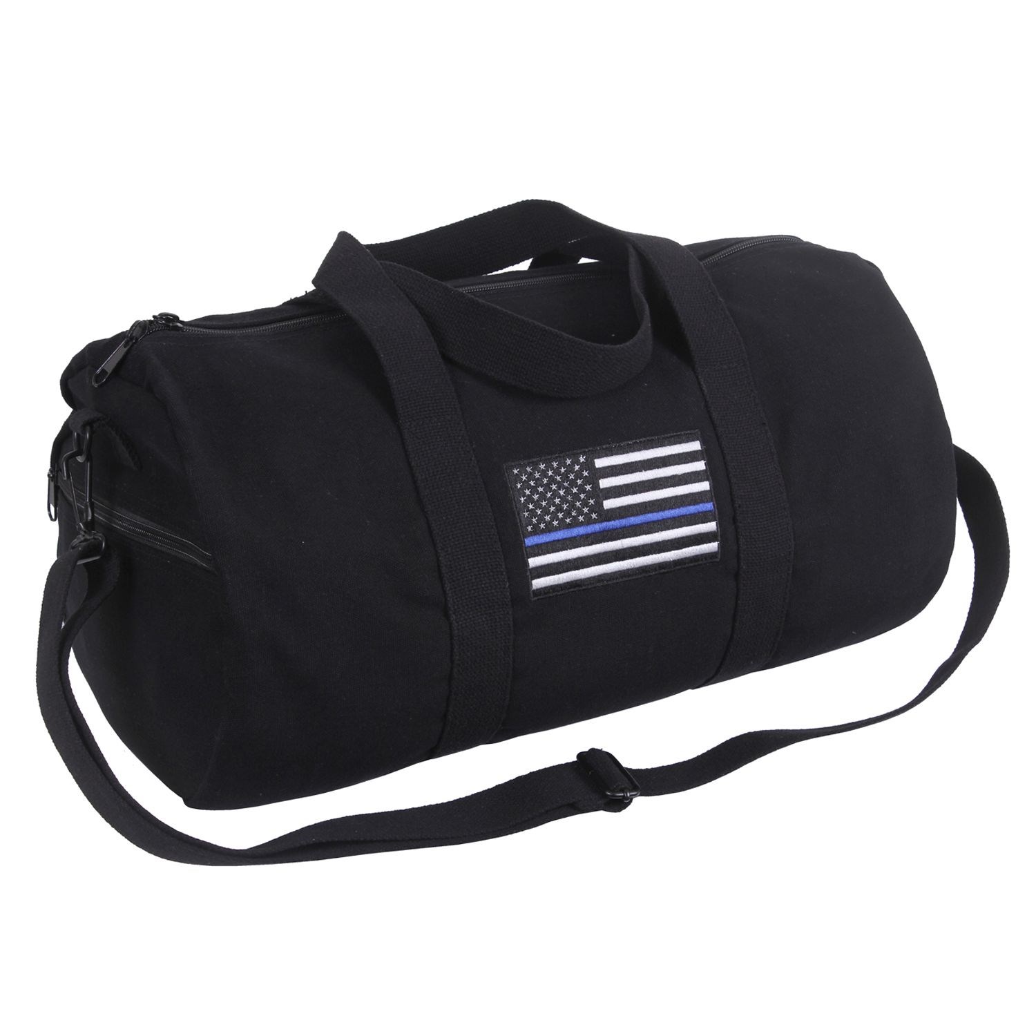 Sac simple et pratique, fabriqué en toile résistante. Sur le côté, le drapeau des États-Unis d'Amérique avec une bande bleue symbolisant le soutien et le respect envers les membres de la police. Sangle d'épaule amovible et réglable.