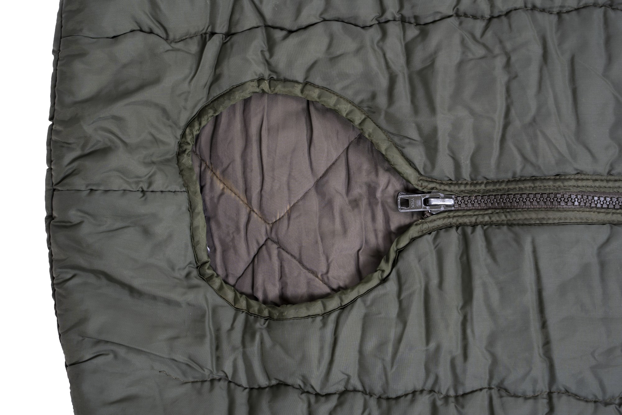Sac de couchage de type momie avec fermeture éclair sur le dessus. La fermeture éclair s'étend sur toute la longueur du sac de couchage. La partie supérieure est fabriquée dans un matériau imperméable, la couche isolante intérieure est matelassée de coton.