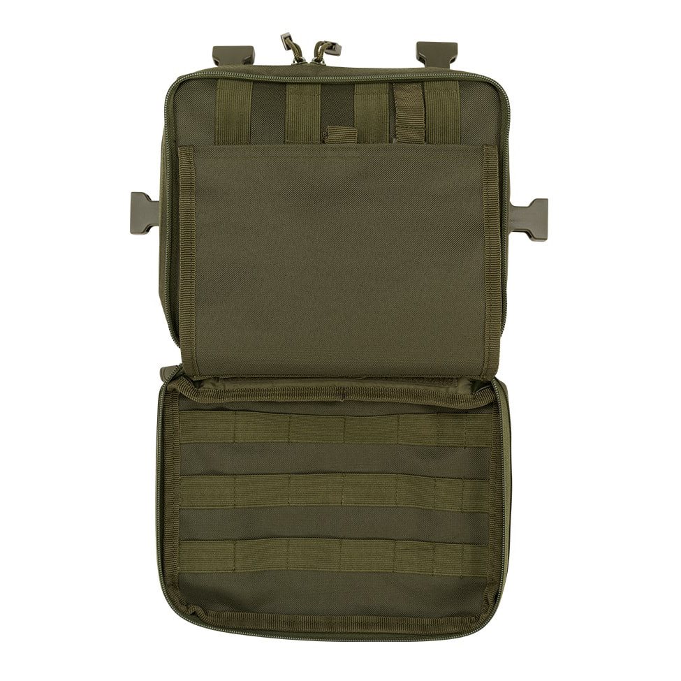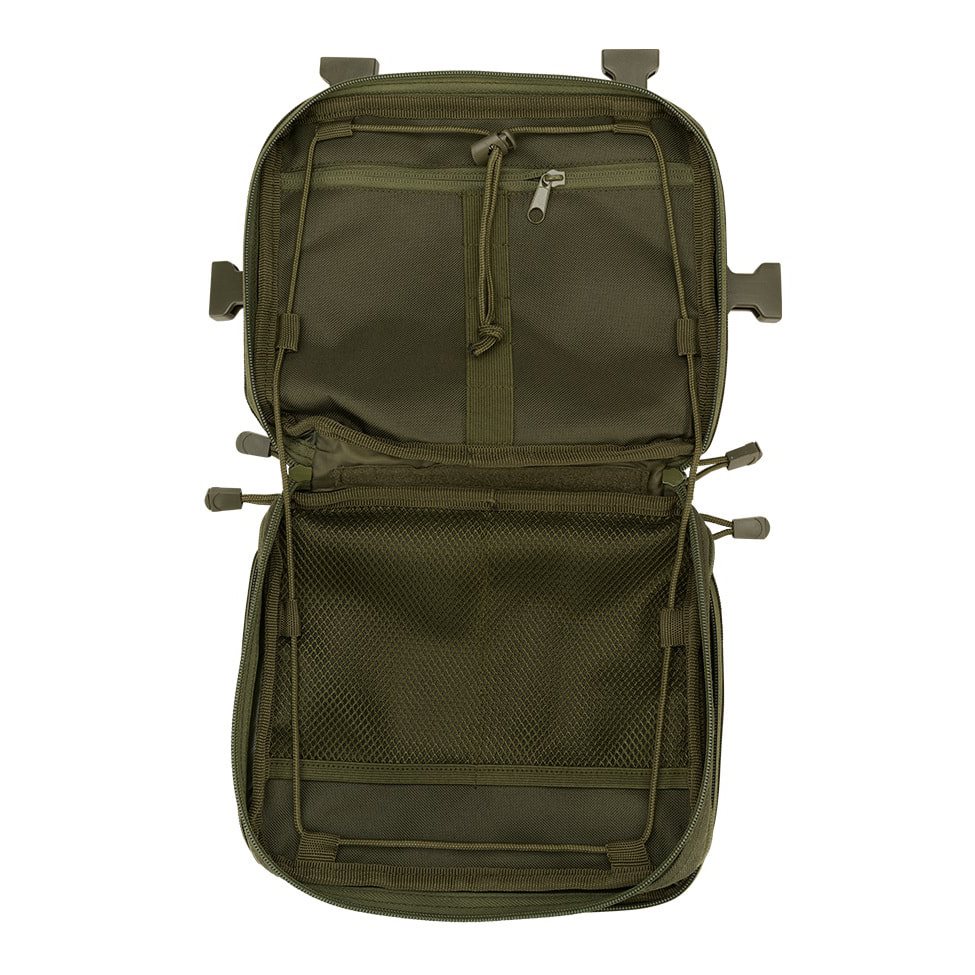 Les sangles de transport sont en forme de H et sont composées en partie d'une maille très respirante et légère et en partie de sangles classiques fixées à l'aide de quatre boucles FASTEX en plastique avec possibilité de retrait rapide. L'arrière du sac est très confortablement rembourré avec une maille 3D douce. La face avant est recouverte de six rangées de sangles modulaires standard MOLLE/PALS. Les deux rangées supérieures sont également équipées de velcro. Vous pouvez ainsi facilement ajouter des équipements compatibles supplémentaires et personnaliser votre sac à dos à l'aide d'écussons et d'étiquettes velcro. Au fond du sac à dos, vous trouverez une petite poche en maille.