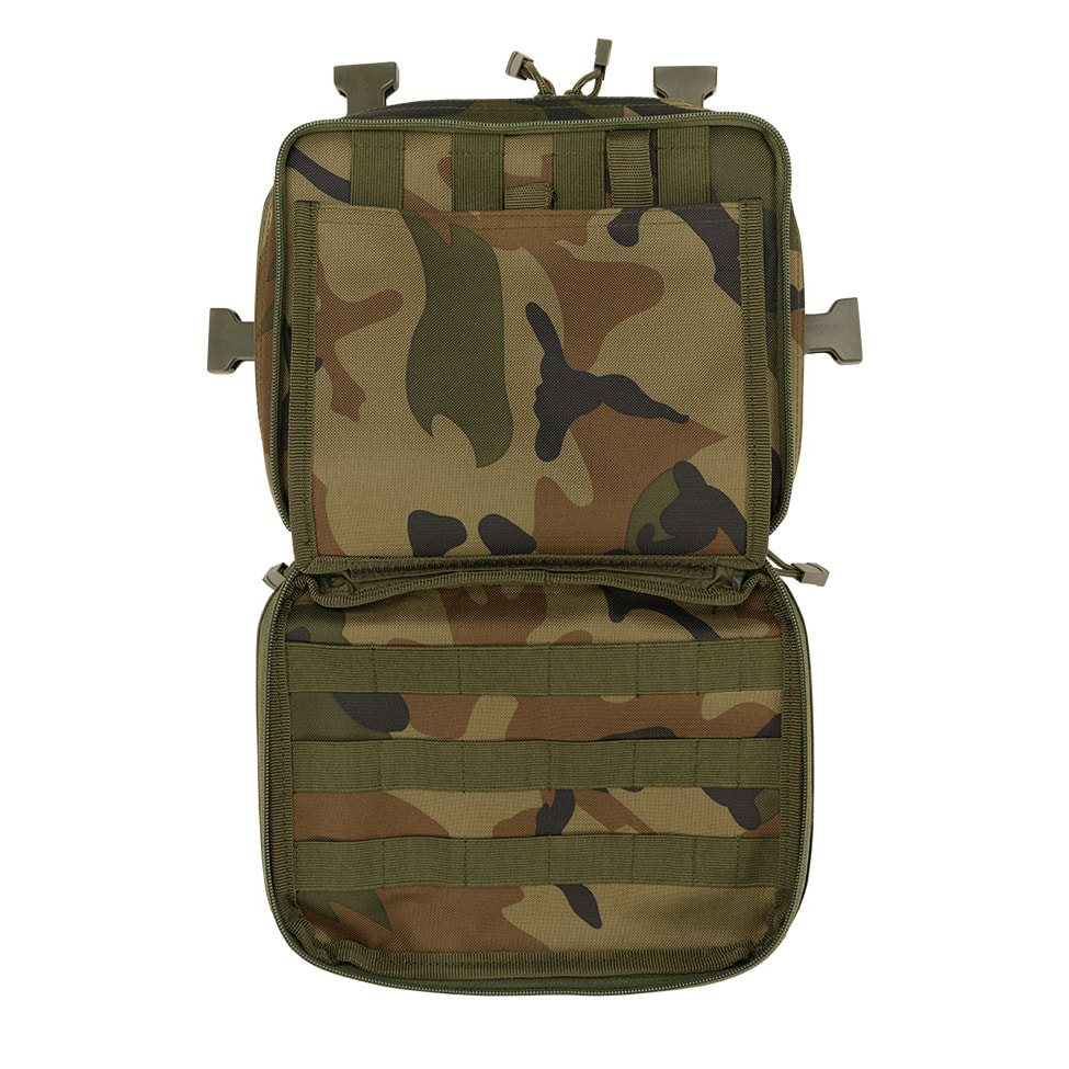 Les sangles de transport sont en forme de H et sont composées en partie d'une maille très respirante et légère et en partie de sangles classiques fixées à l'aide de quatre boucles FASTEX en plastique avec possibilité de retrait rapide. L'arrière du sac est très confortablement rembourré grâce à une maille 3D douce. La face avant est cousue de six rangées de sangles modulaires standard MOLLE/PALS. Les deux rangées supérieures sont en outre combinées avec du velcro. Vous pouvez ainsi facilement équiper le sac d'accessoires compatibles supplémentaires et le personnaliser à l'aide d'écussons et d'étiquettes à velcro. Au fond du sac, vous trouverez une petite poche en maille.