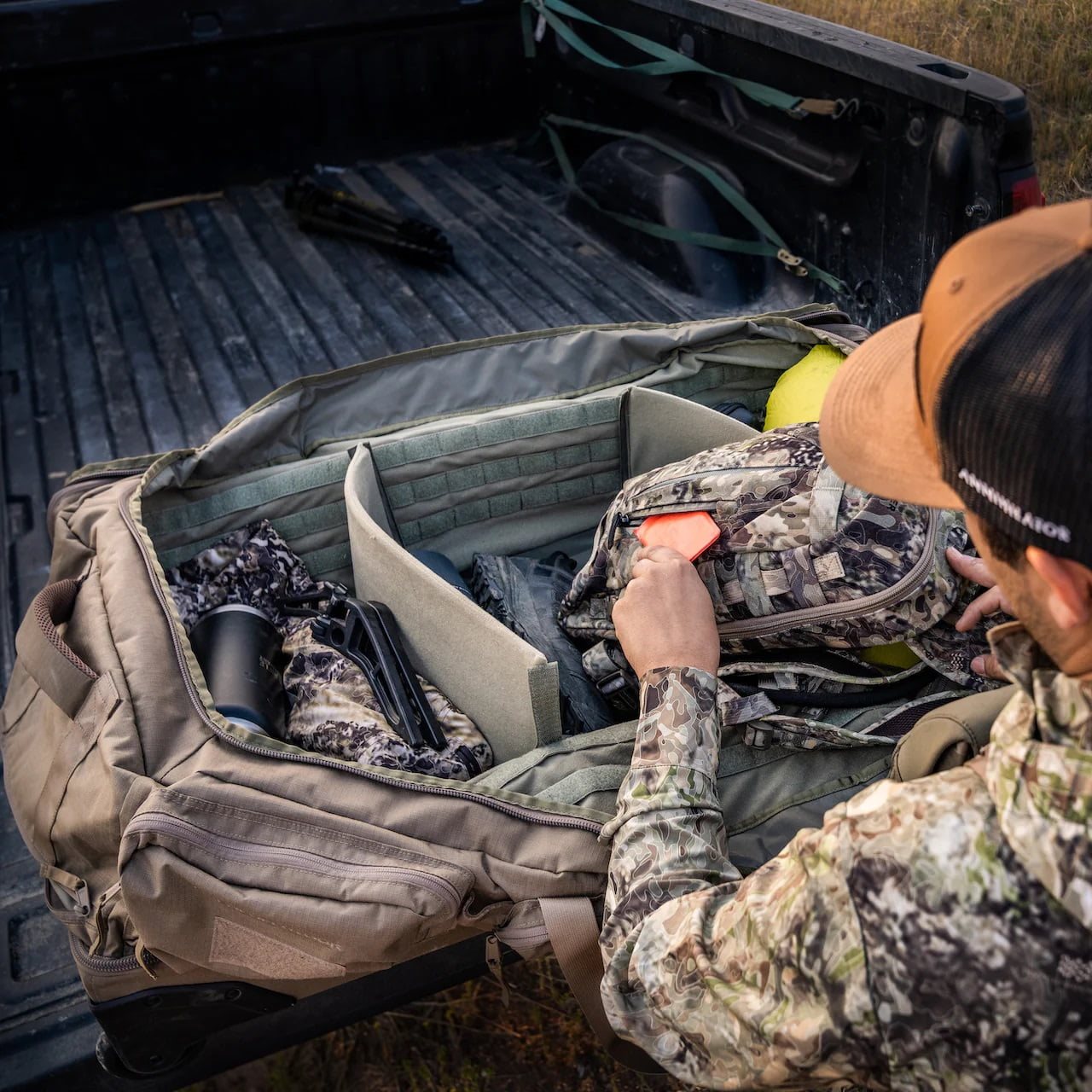 Le sac HERCULES dispose essentiellement de deux compartiments principaux, tous deux accessibles par des fermetures éclair YKK® à double sens avec des tirettes plates en tissu. La partie supérieure du sac est recouverte à l'intérieur d'un matériau Nylex®, qui est un molleton à poils courts. Ce molleton peut être utilisé soit pour fixer des équipements compatibles, soit pour diviser l'espace à l'aide de deux cloisons souples fournies avec le sac. Les côtés intérieurs sont bordés de trois rangées de sangles MOLLE/PALS. L'espace inférieur est divisé en deux compartiments par une cloison imperméable fermée par une fermeture éclair. Vous apprécierez cette fonctionnalité si vous avez besoin de séparer les vêtements secs des vêtements mouillés ou les vêtements sales des vêtements propres. Le compartiment inférieur est également rembourré et équipé d'une paire de sangles de compression, vous pouvez donc y ranger votre arme à feu ou votre arc de chasse en toute sécurité. Si vous rencontrez des conditions météorologiques défavorables pendant votre voyage, un imperméable de couleur coyote brown est rangé dans un compartiment caché, qui recouvre facilement l'ensemble du sac.
