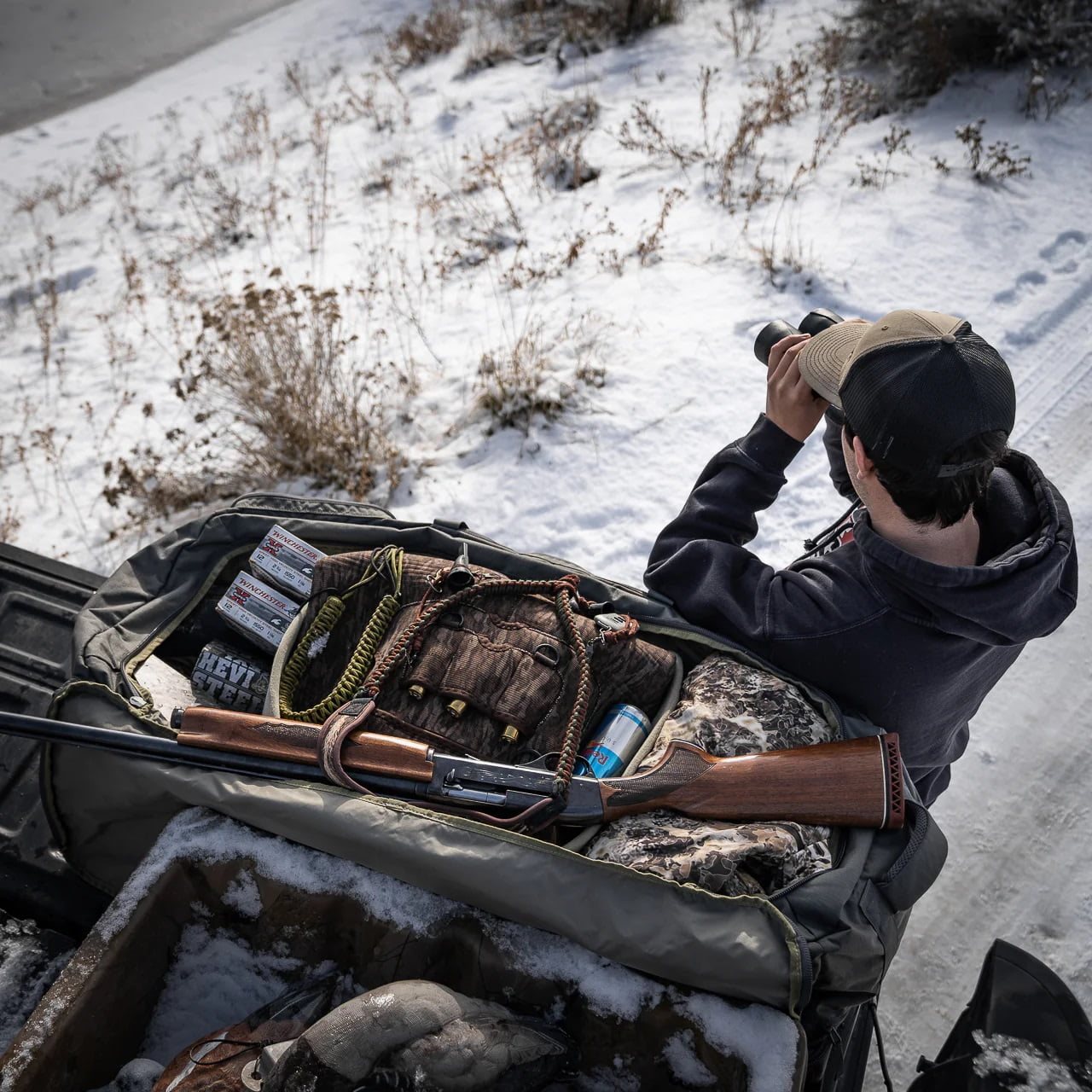 Le sac HERCULES dispose essentiellement de deux compartiments de rangement principaux, tous deux accessibles par des fermetures éclair YKK® à double sens avec des tirettes plates en tissu. La partie supérieure du sac est recouverte à l'intérieur de Nylex®, un tissu molletonné à poils courts. Ce molleton peut être utilisé soit pour fixer des équipements compatibles, soit pour diviser l'espace à l'aide de deux cloisons souples fournies avec le sac. Les côtés intérieurs sont bordés de trois rangées de sangles MOLLE/PALS. L'espace inférieur est divisé en deux compartiments par une cloison imperméable fermée par une fermeture éclair. Vous apprécierez cette fonctionnalité si vous avez besoin de séparer les vêtements secs des vêtements mouillés ou les vêtements sales des vêtements propres. Le compartiment inférieur est également rembourré et équipé d'une paire de sangles de compression, vous pouvez donc y ranger votre arme à feu ou votre arc de chasse en toute sécurité. Si vous rencontrez des conditions météorologiques défavorables pendant vos déplacements, un imperméable de couleur coyote brown est rangé dans un compartiment caché, qui recouvre facilement l'ensemble du sac.