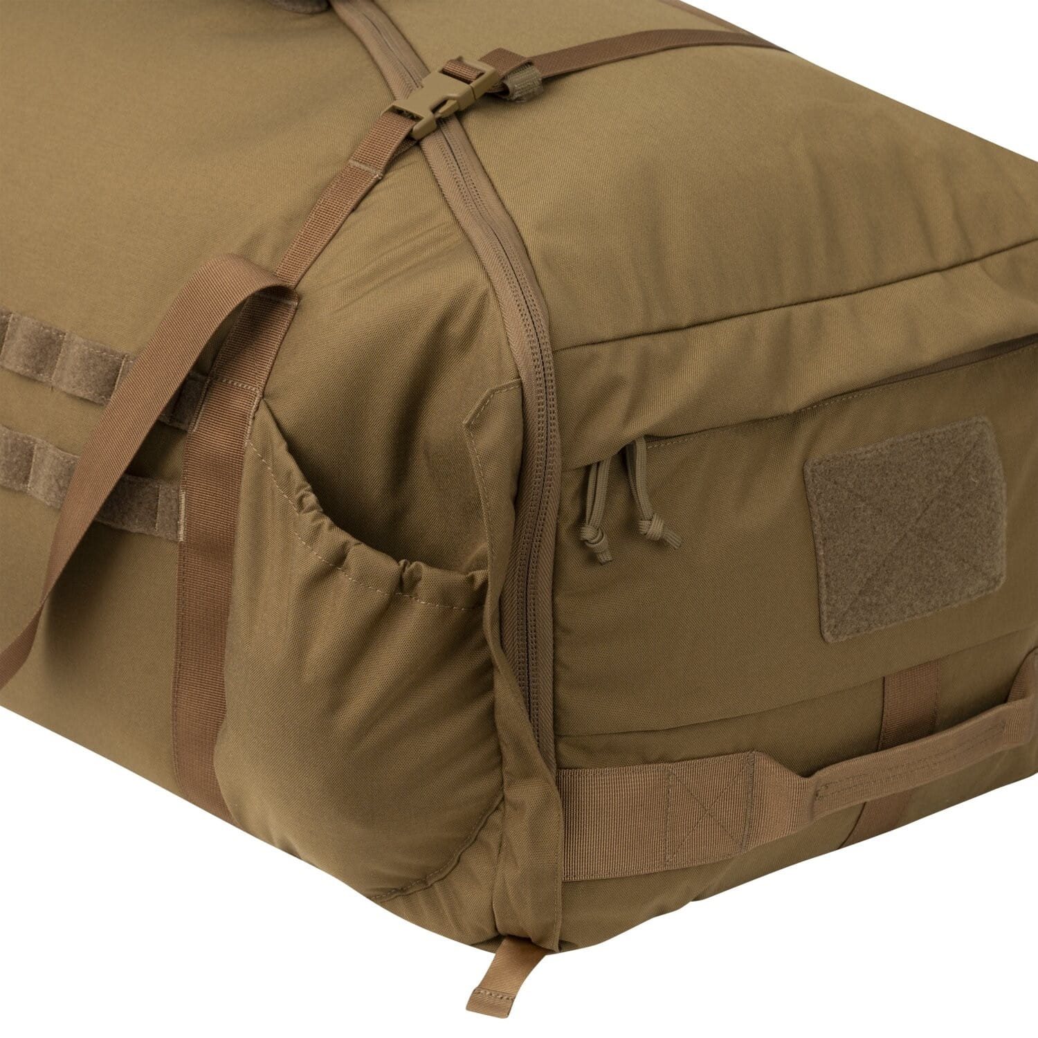 Le sac peut être transporté de trois façons différentes. Il est possible d'utiliser les poignées classiques, la bandoulière réglable et légèrement rembourrée, ou encore de le porter comme un sac à dos grâce aux sangles dissimulées au fond du sac. À l'extérieur, vous trouverez plusieurs poches pratiques pour les petits objets, un système de fixation modulaire MOLLE/PALS, des bandes Velcro pour la personnalisation à l'aide d'écussons VELCRO et deux compartiments plats fermés par des fermetures éclair à double sens. À l'intérieur du sac, vous trouverez quatre poches en filet.