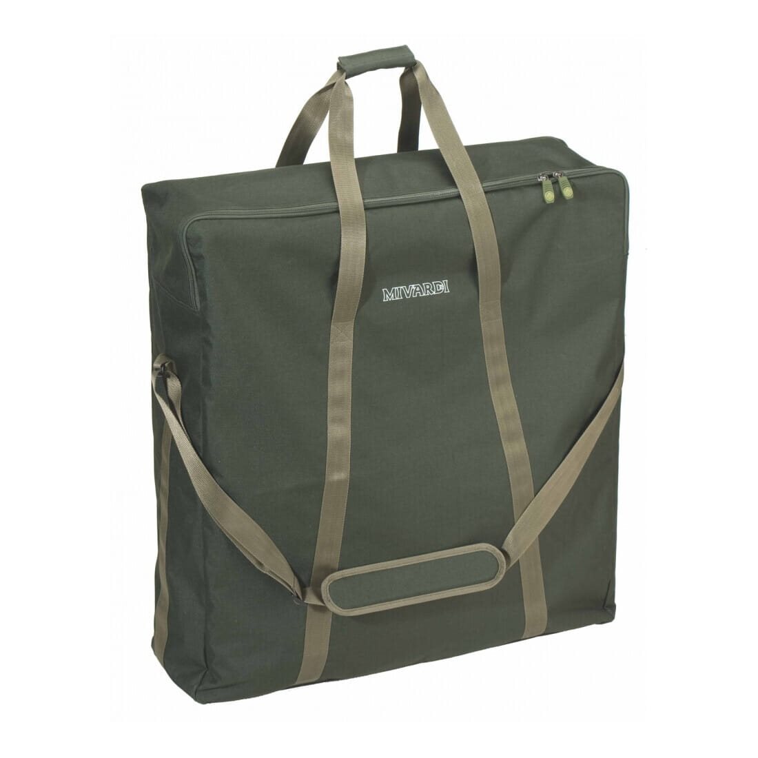Sac de transport robuste et imperméable en B-POL600D, spécialement conçu pour la chaise longue Mivardi Professional Hex8. Il est équipé de poignées solides pour le transport, d'une bandoulière réglable et d'une fermeture éclair robuste avec des tirettes Mivardi design.