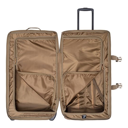 Grand sac de voyage/valise avec compartiment principal divisé pour une organisation facile du contenu. Fabriqué en tissu polyester HRF 600D résistant avec traitement déperlant DWR-TECH. Plus d'informations