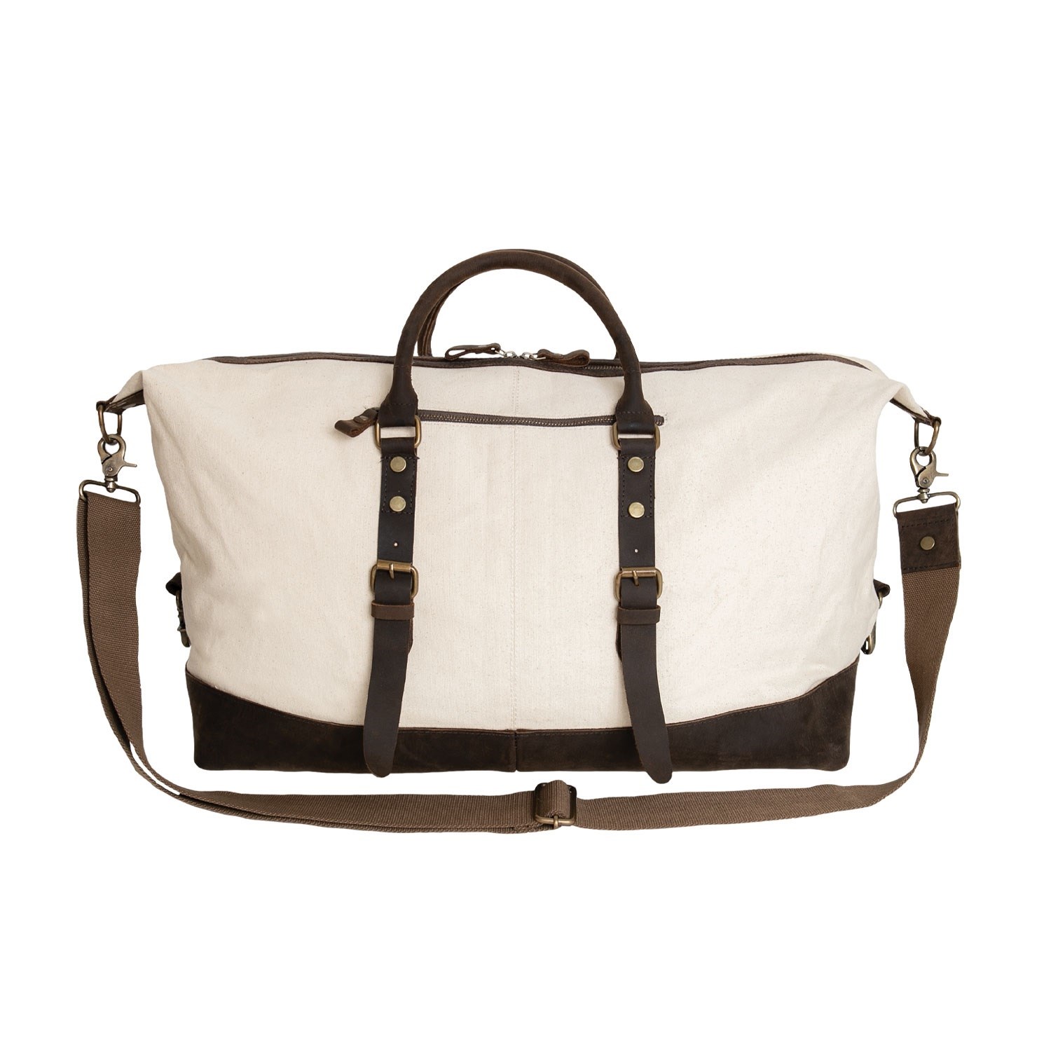Sac de voyage pouvant être porté à la main ou à l'épaule, orné de cuivres et d'accessoires en cuir. Les dimensions du sac sont d'environ 58 x 28 x 35 cm. Il est équipé d'une bandoulière amovible. Matériau : 100 % coton, cuir, cuivre. Plus d'informations
